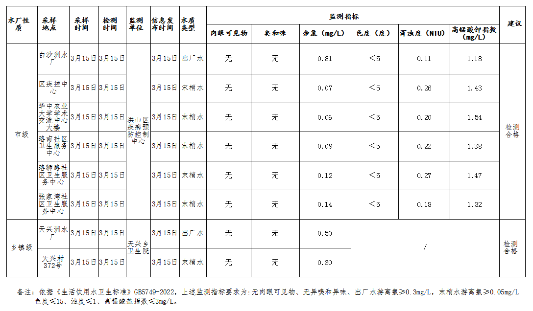 标     题 洪山区生活饮用水 2026年3月15日监测结果