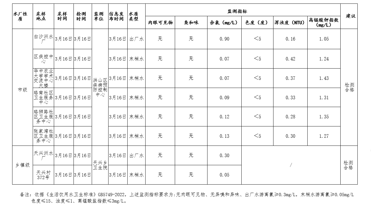标     题 洪山区生活饮用水 2026年3月16日监测结果