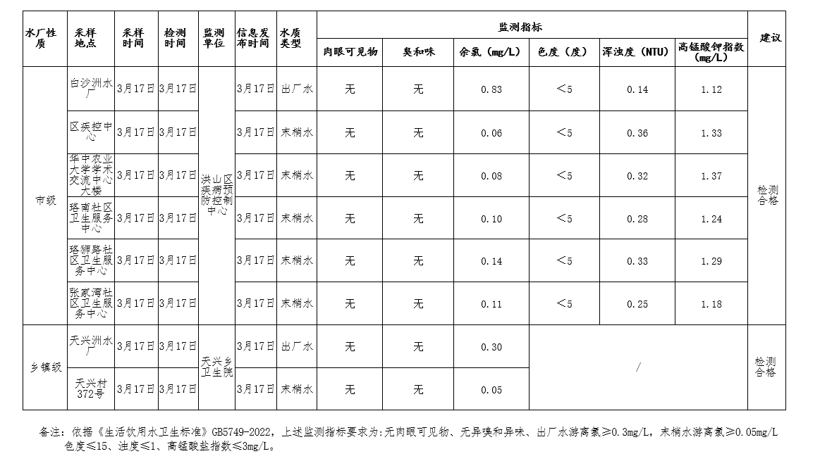 标     题 洪山区生活饮用水 2026年3月17日监测结果