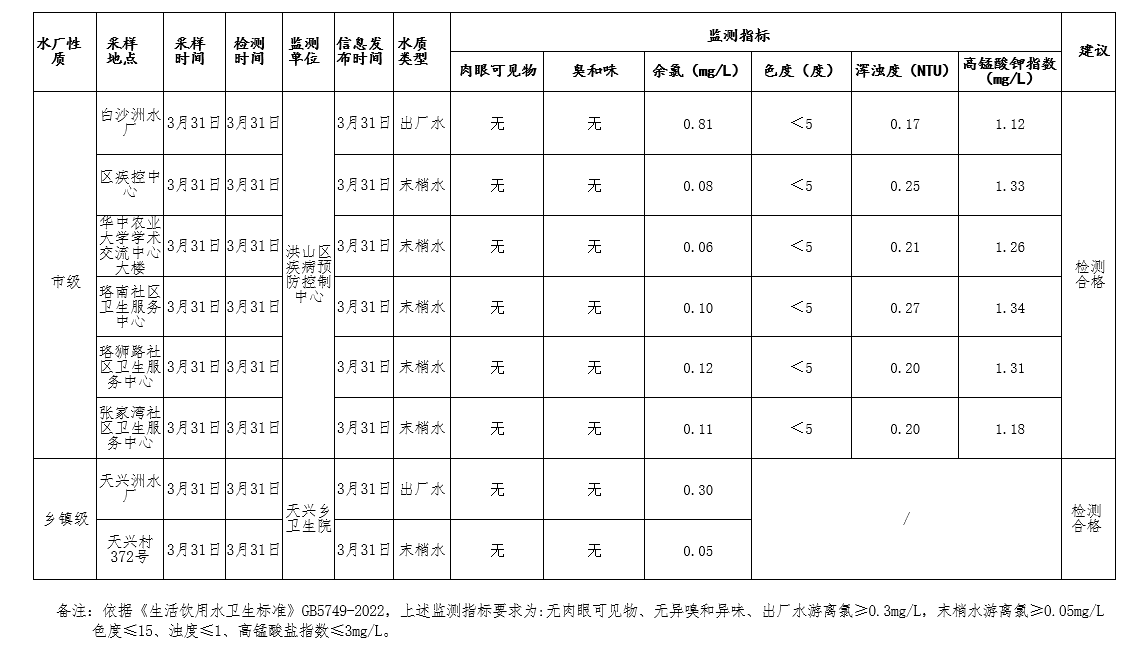 标     题 洪山区生活饮用水 2026年3月31日监测结果