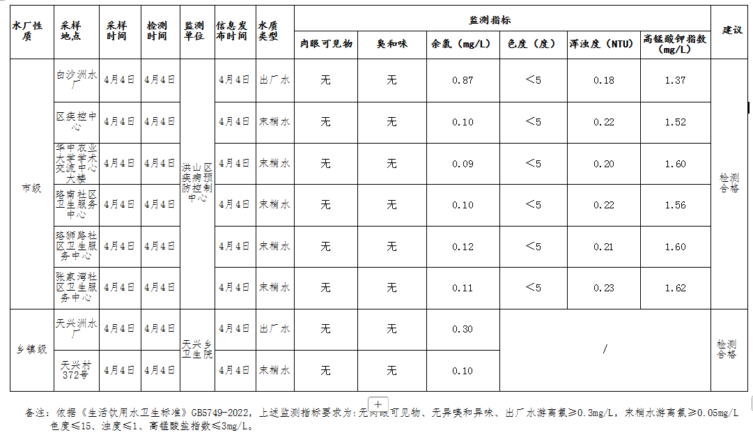 标     题 洪山区生活饮用水 2026年4月4日监测结果