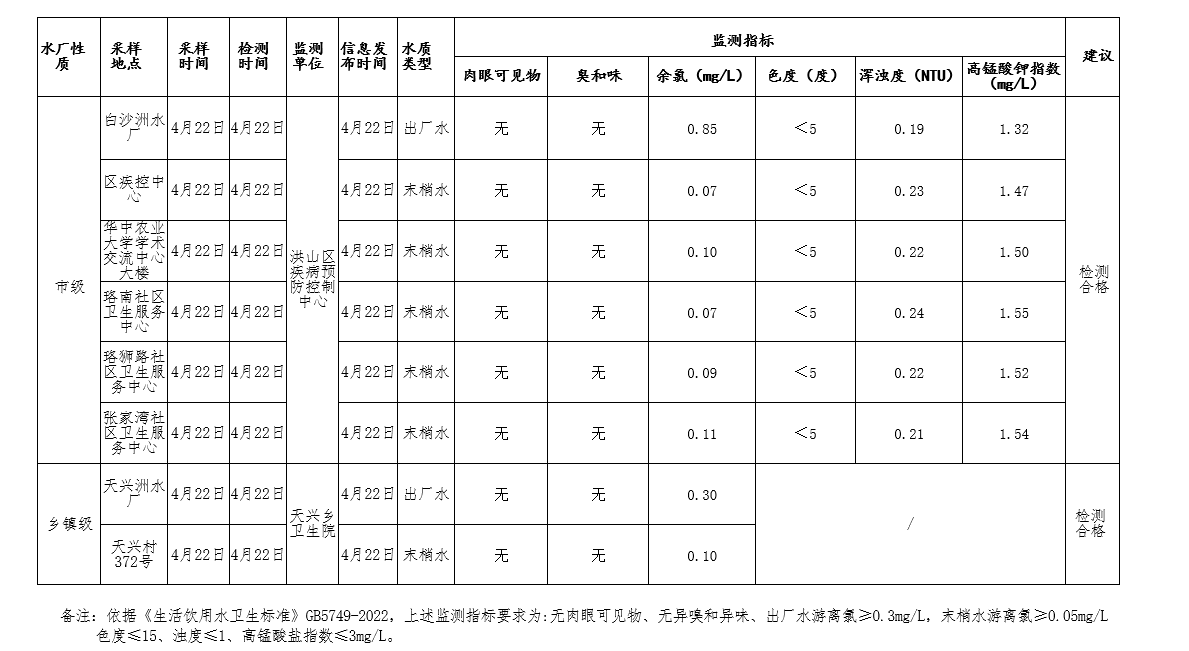 标     题 洪山区生活饮用水 2026年4月22日监测结果
