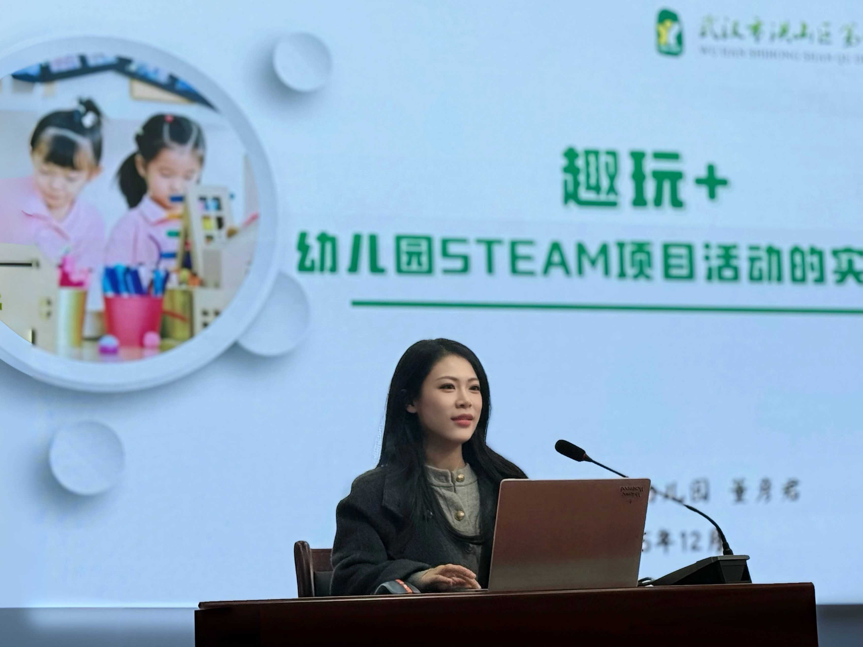 专题培训阶段,童玲以《幼小衔接背景下基于儿童视角的探究式学习实践探索》为题开讲,明确“幼小衔接”“儿童视角”等核心概念,分享洪山区“三体双翼”幼小衔接实践经验,结合多园案例解读“1+5+N”探究式学习在幼儿“运动游戏”“生活学习”中的实施路径,将教育理念转化为可落地的教学策略。