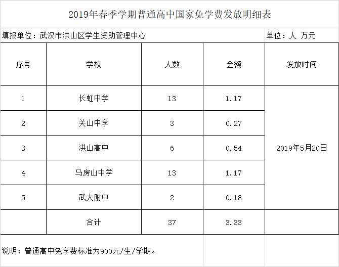 标     题 2019年春季学期普通高中国家免学费发放明细表
