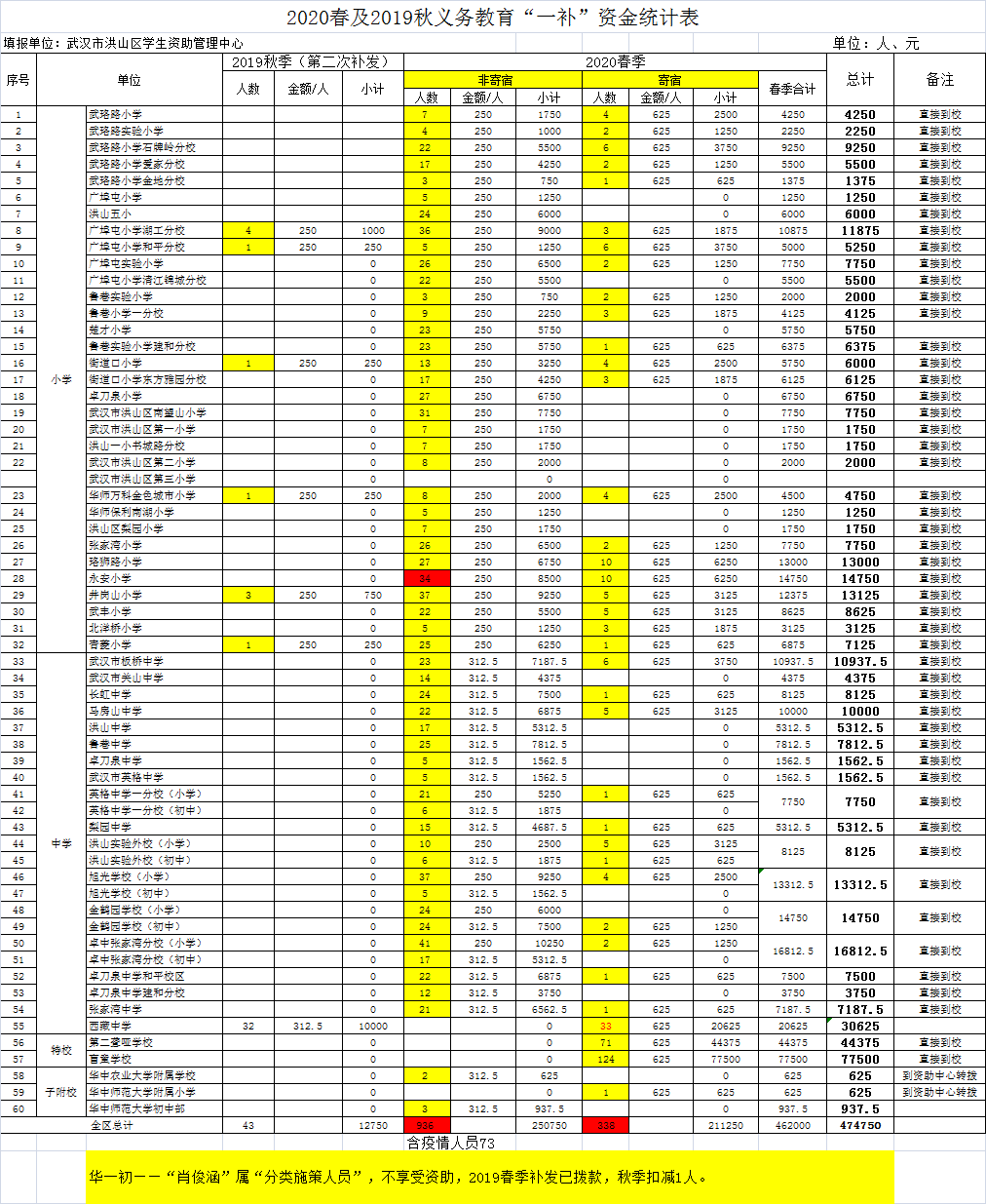 2019秋和2020春季义务段补助资金统计表(总表)