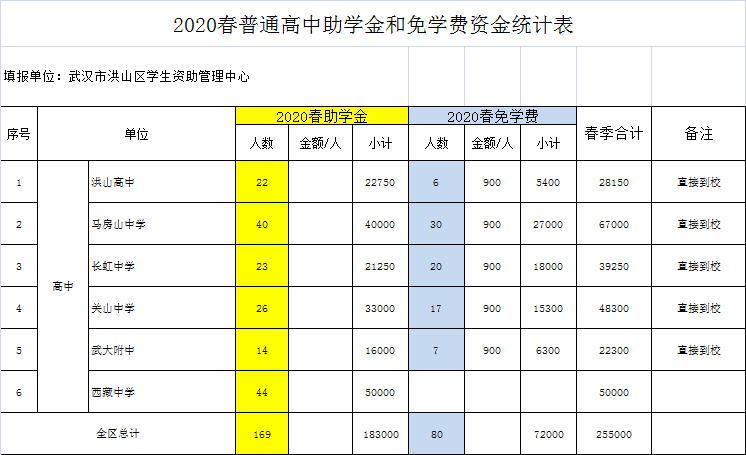 标     题 2020春季普通高中助学金和免学费资金统计表