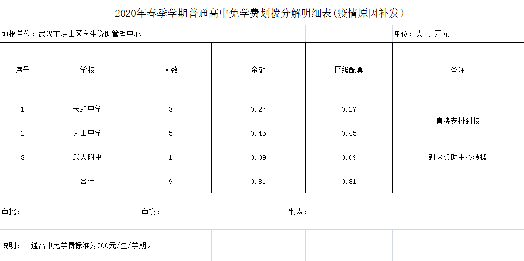 2020年春季学期普通高中免学费划拨分解明细表