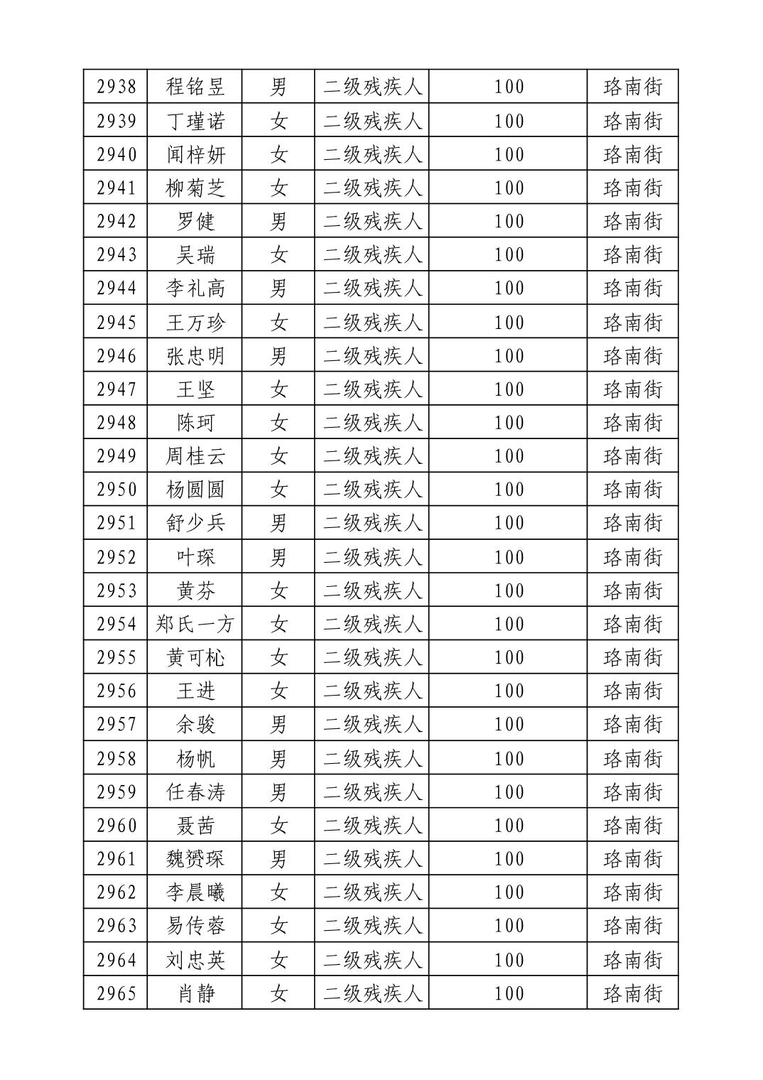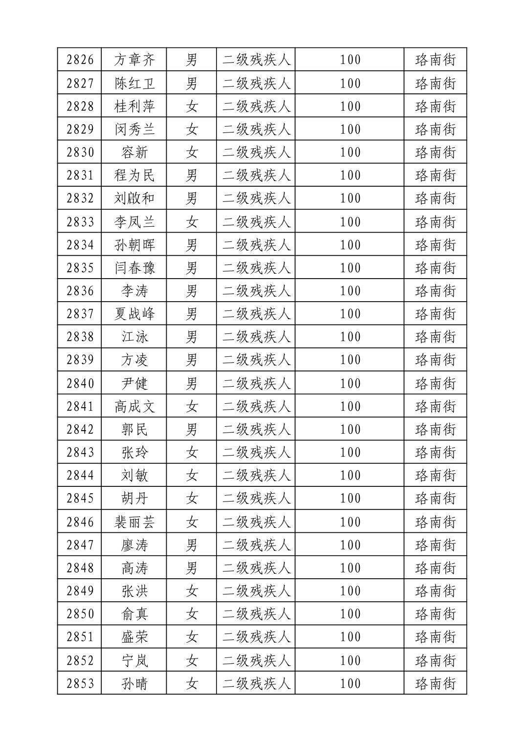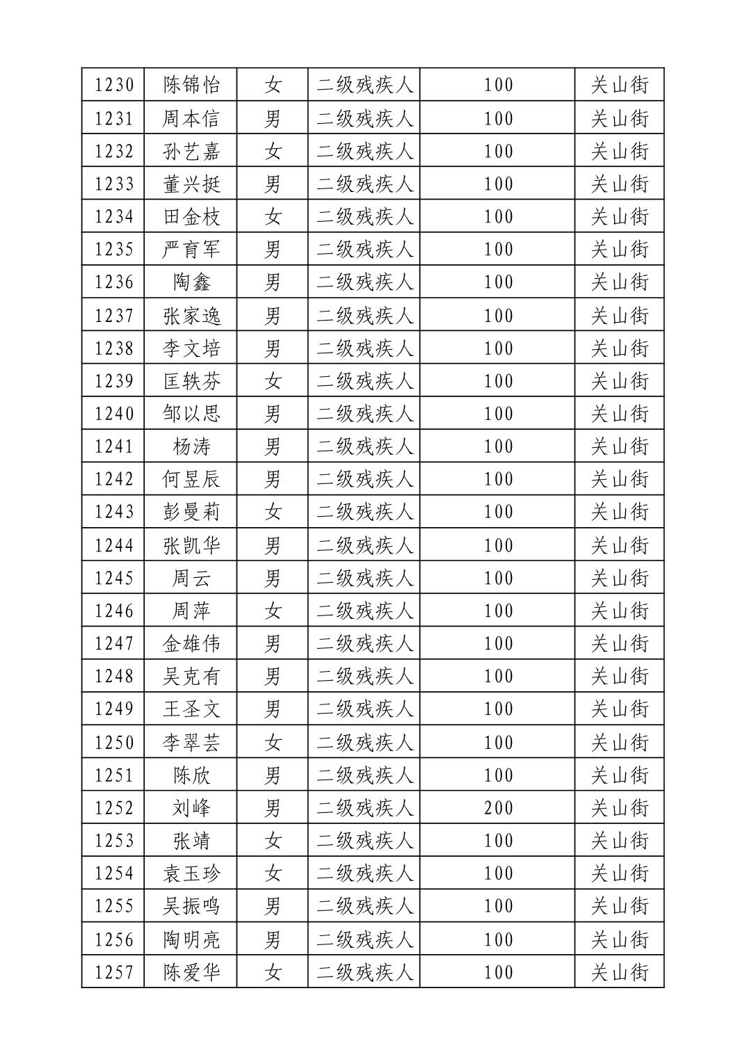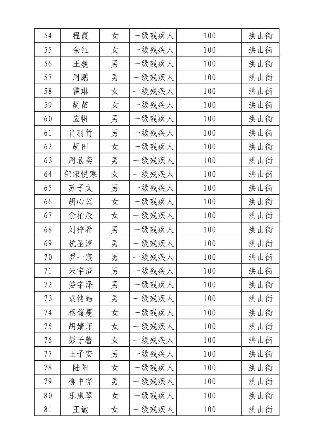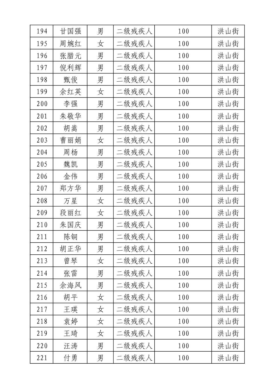 2025年9月武汉市洪山区重度残疾人护理补贴发放表