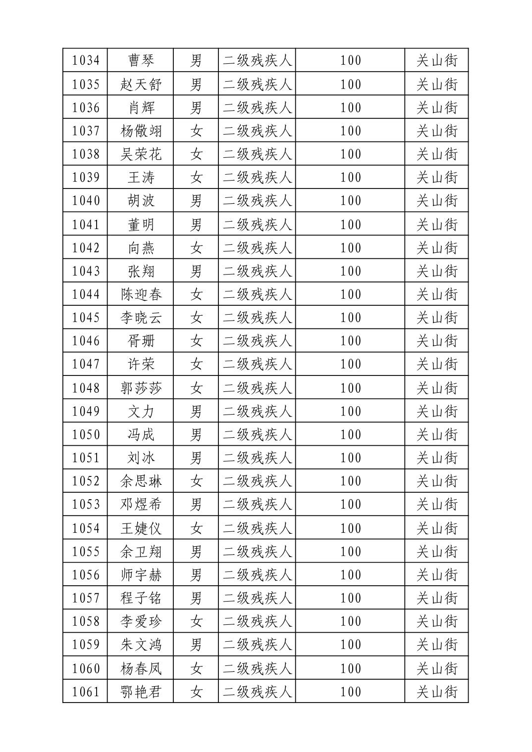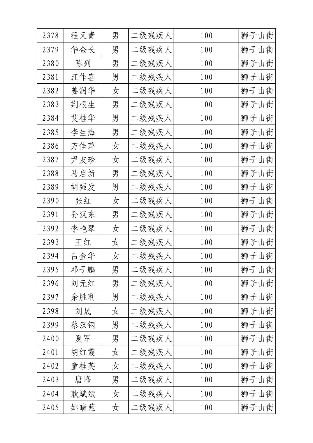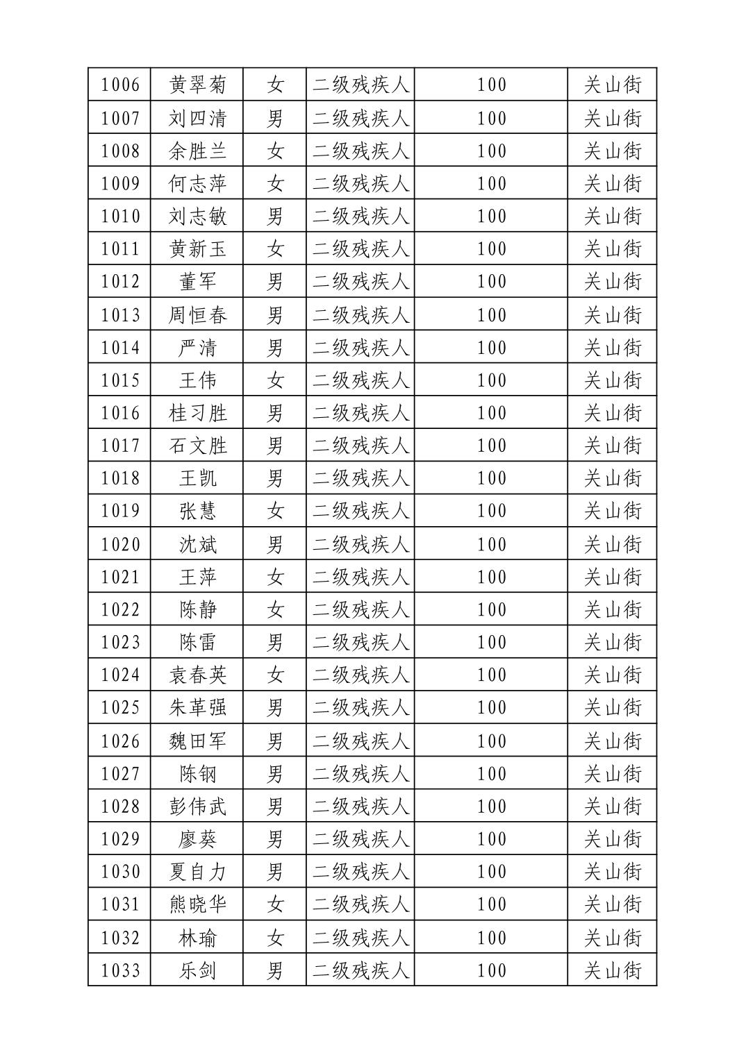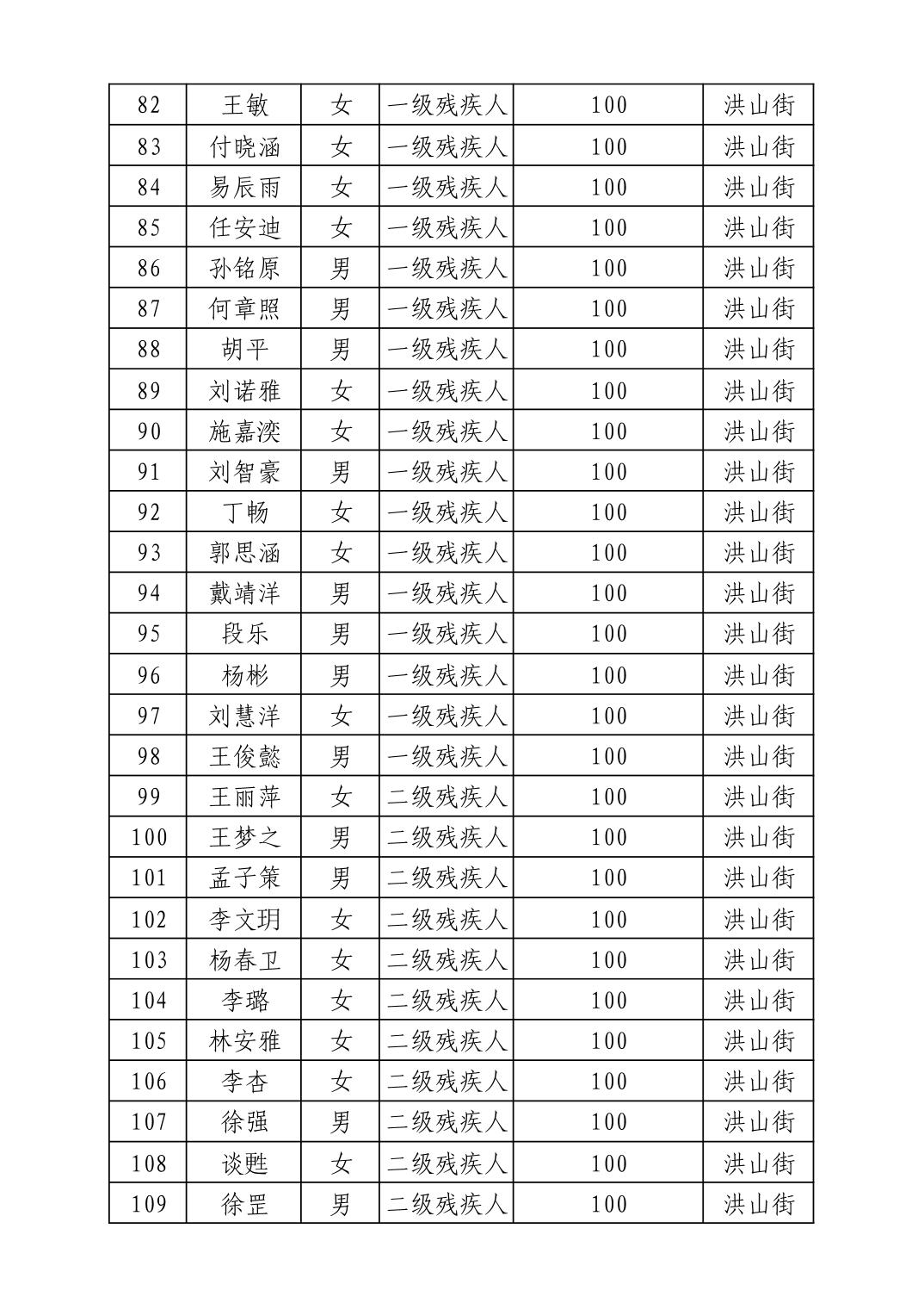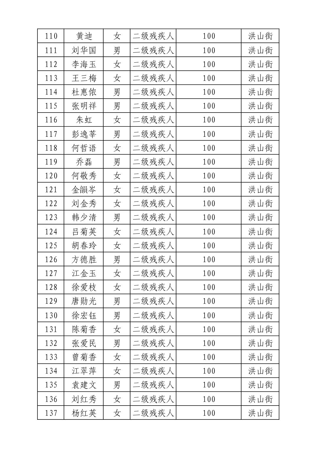 2025年10月武汉市洪山区重度残疾人护理补贴发放表