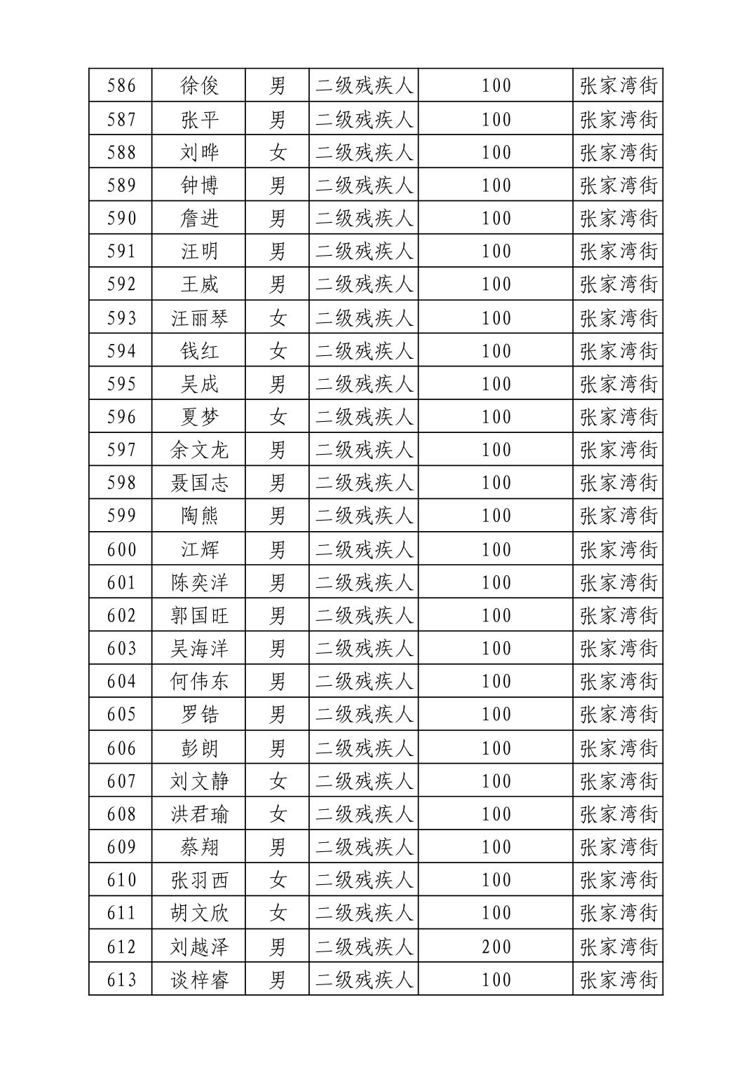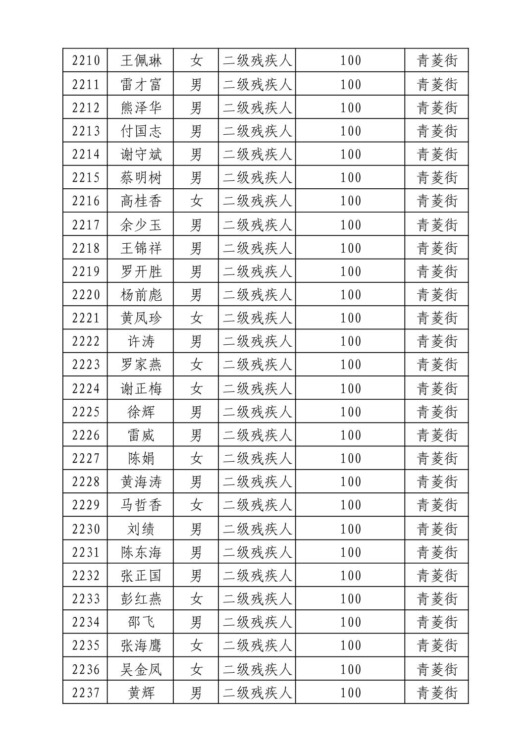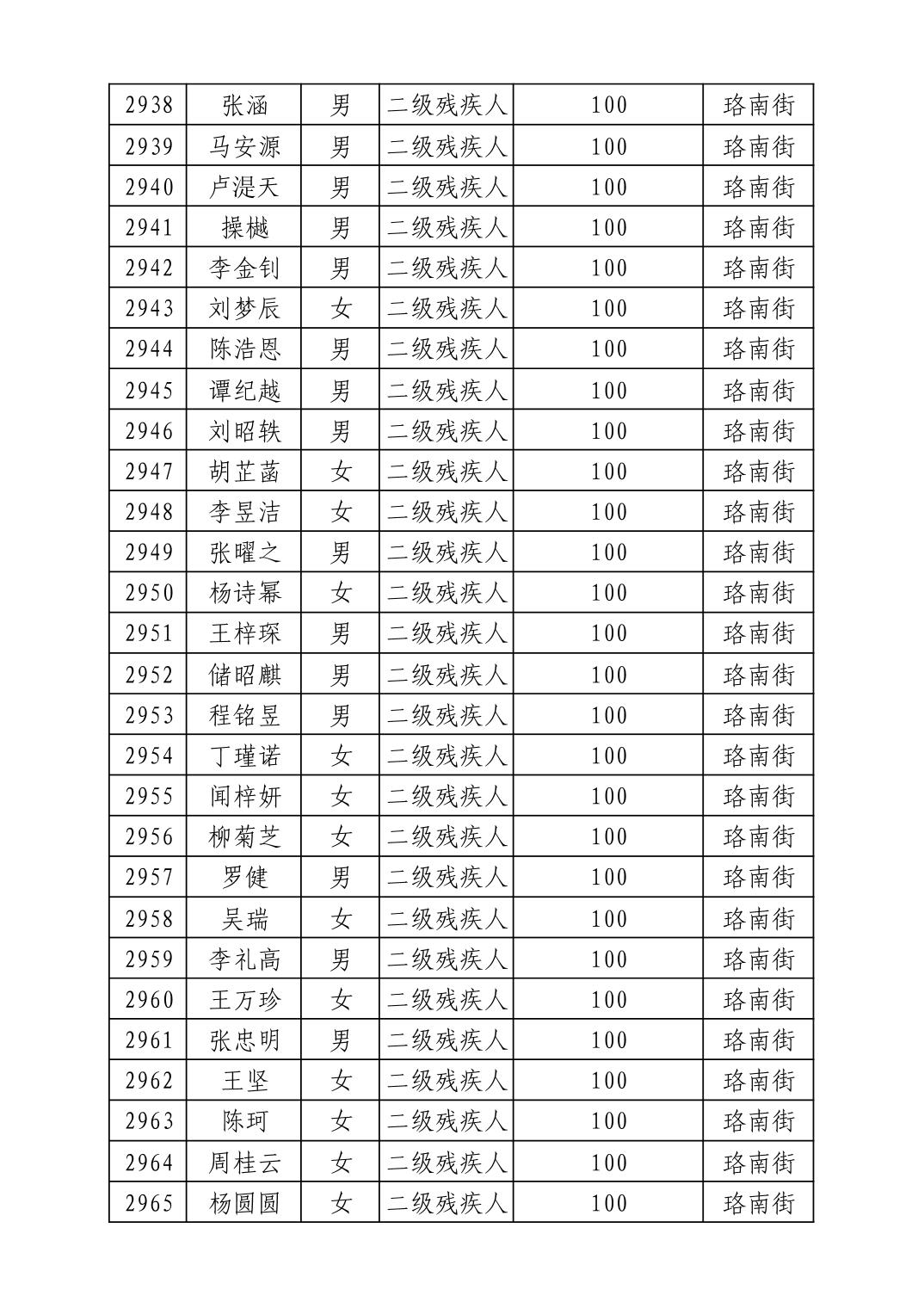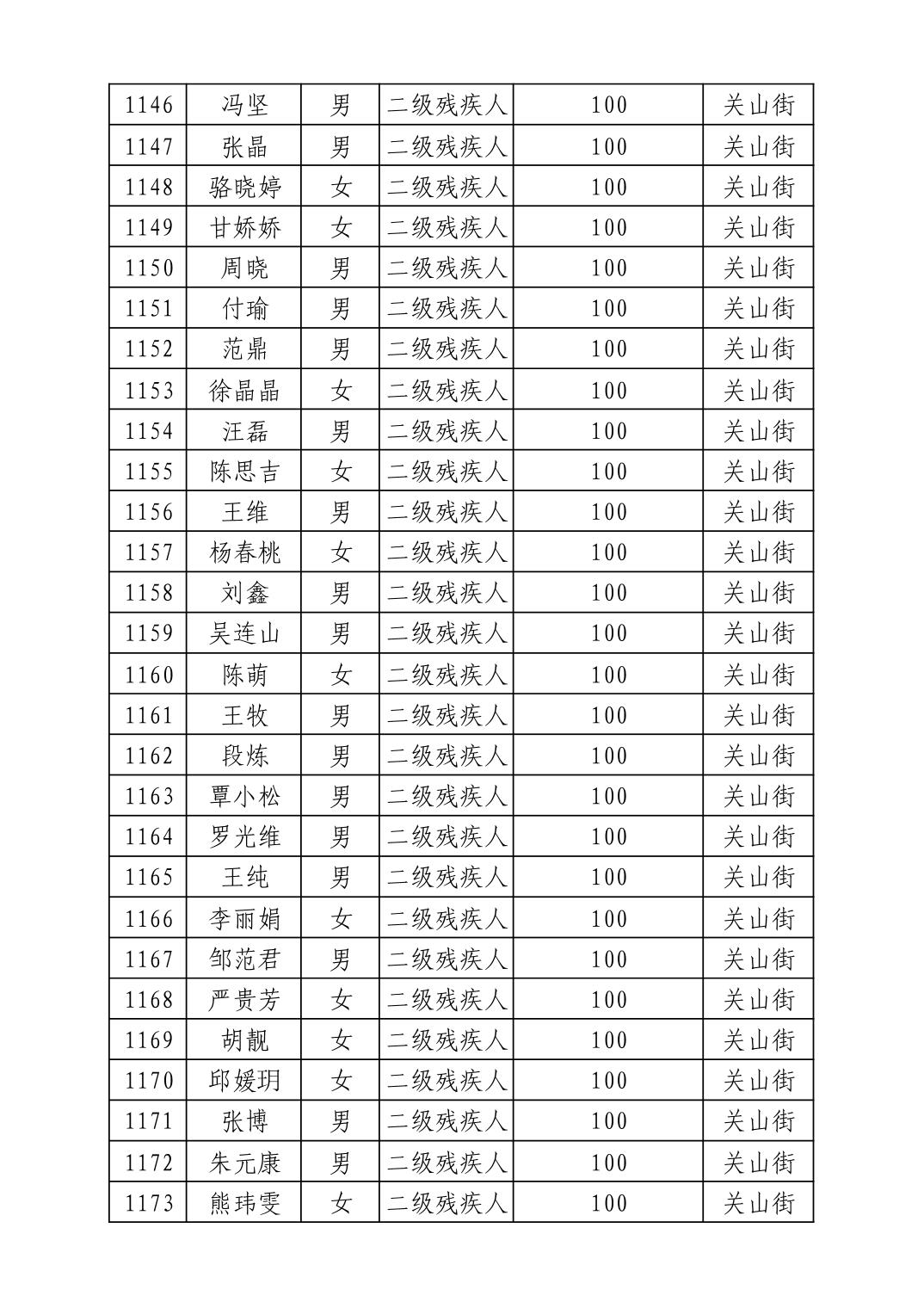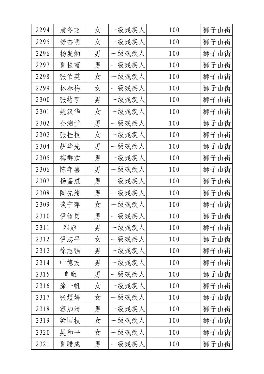 2025年10月武汉市洪山区重度残疾人护理补贴发放表