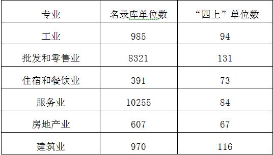 注:“四上”单位:1、规模以上工业(年主营业务收入2000万元以上); 2、限额以上批零和住餐业(年主营业务2000万元以上批发企业;年主营业务收入500万元以上的零售企业;年主营业务收入200万元以上的住宿企业和餐饮企业);3、规模以上服务业(年主营业务收入1000万元以上或从业人员50人以上);4、资质以上建筑业企业及房地产开发企业。(综合统计调查科 王星景)