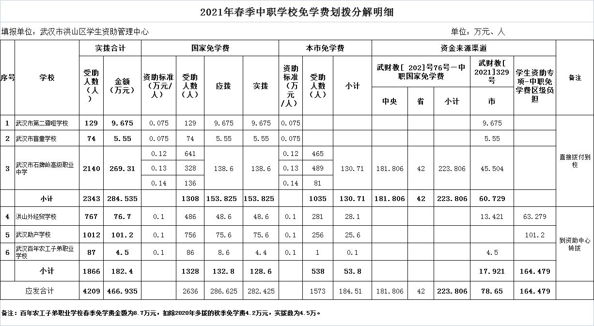 名 称:2021年春季中职学校免学费划拨分解明细
