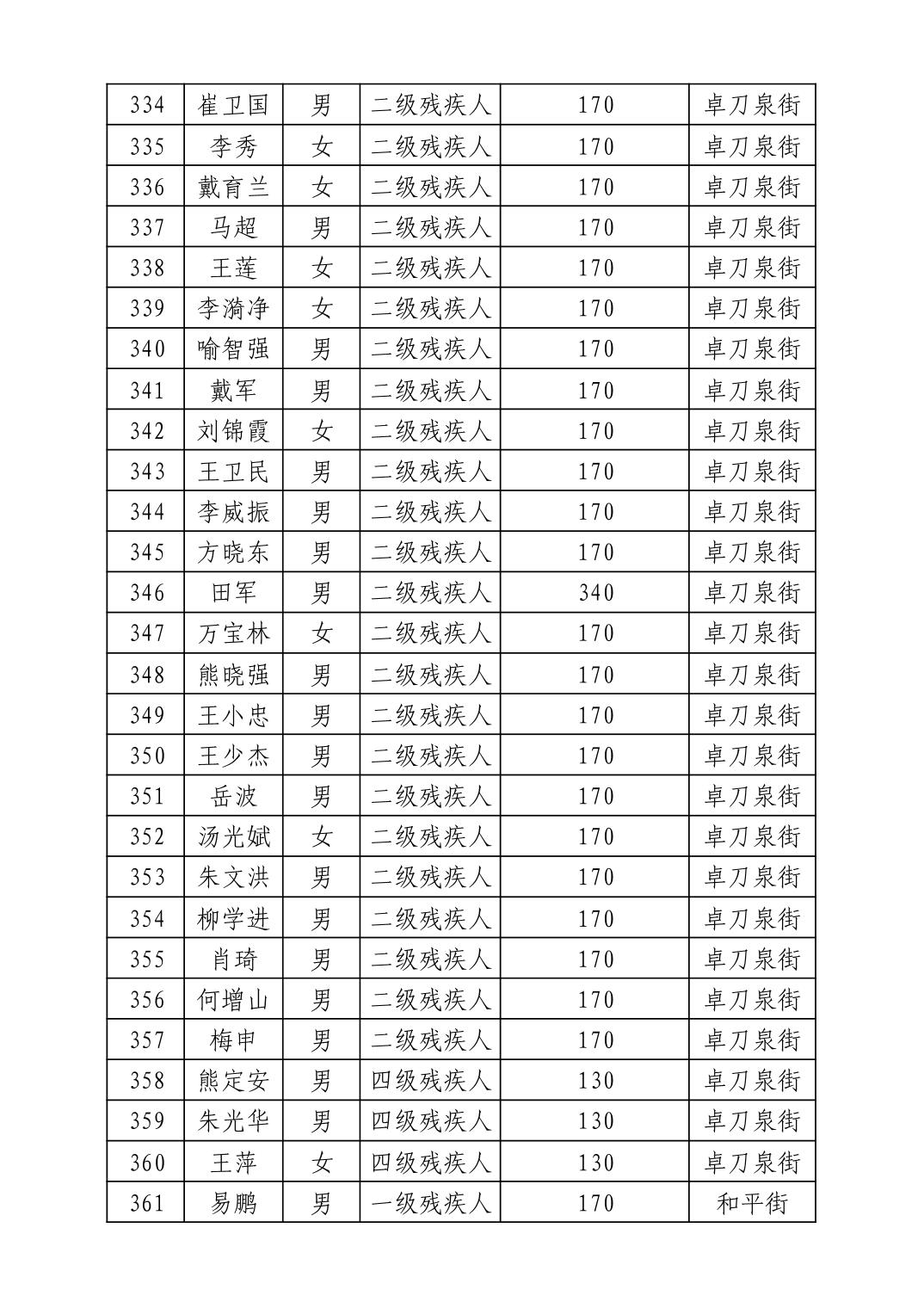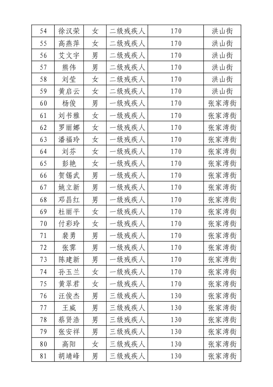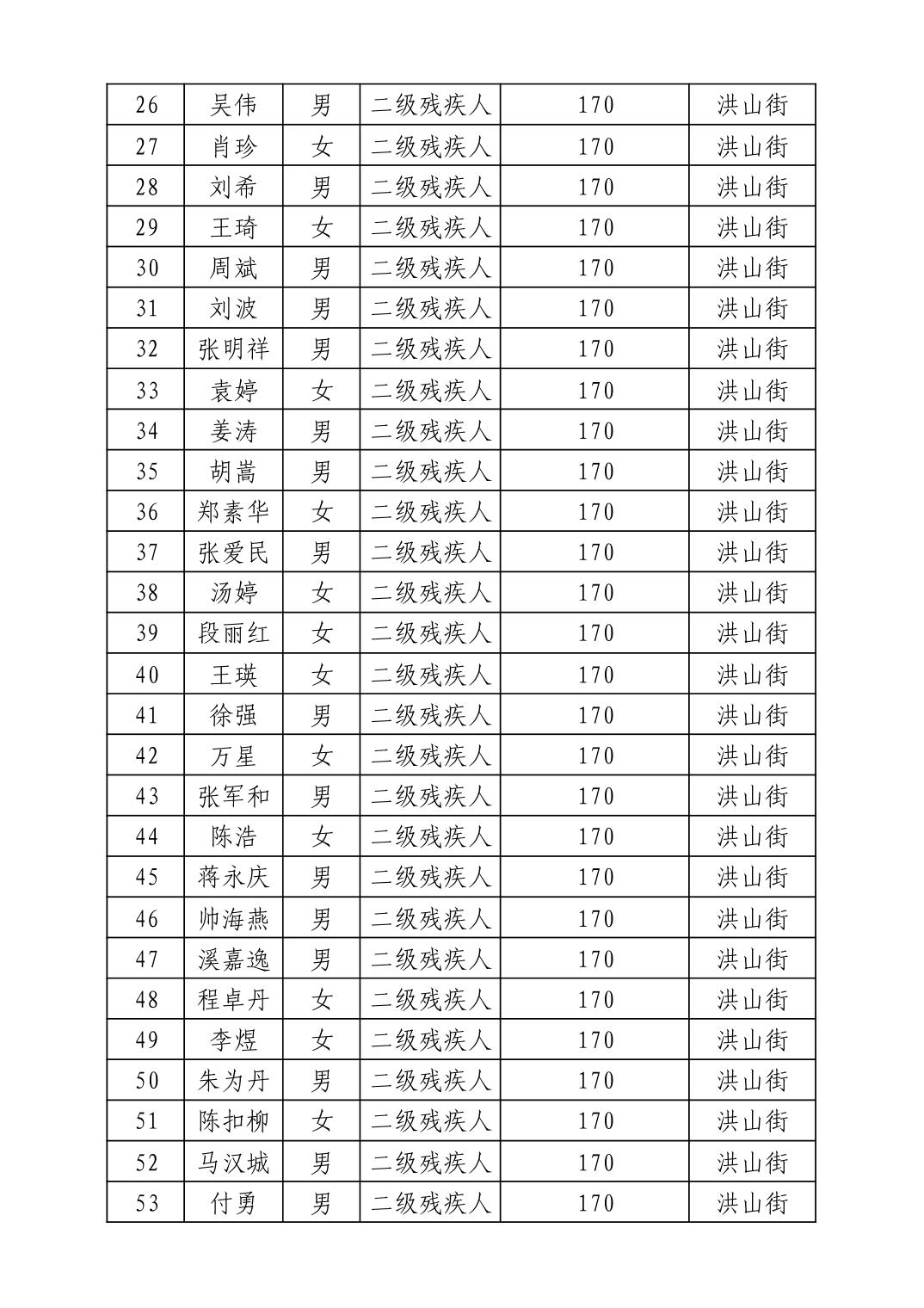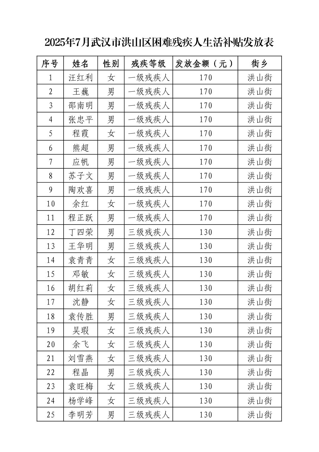 名 称:2025年7月武汉市洪山区困难残疾人生活补贴发放表