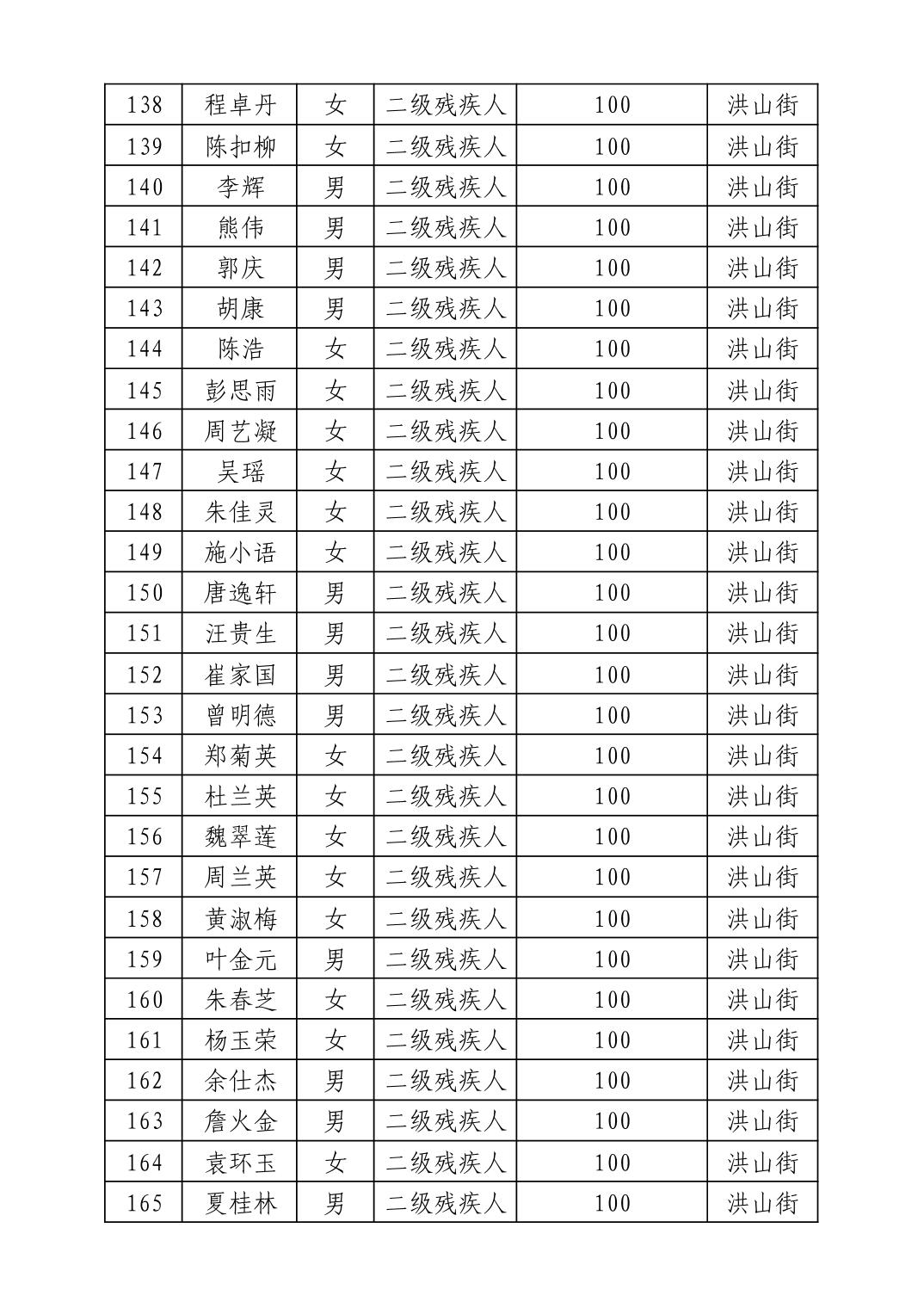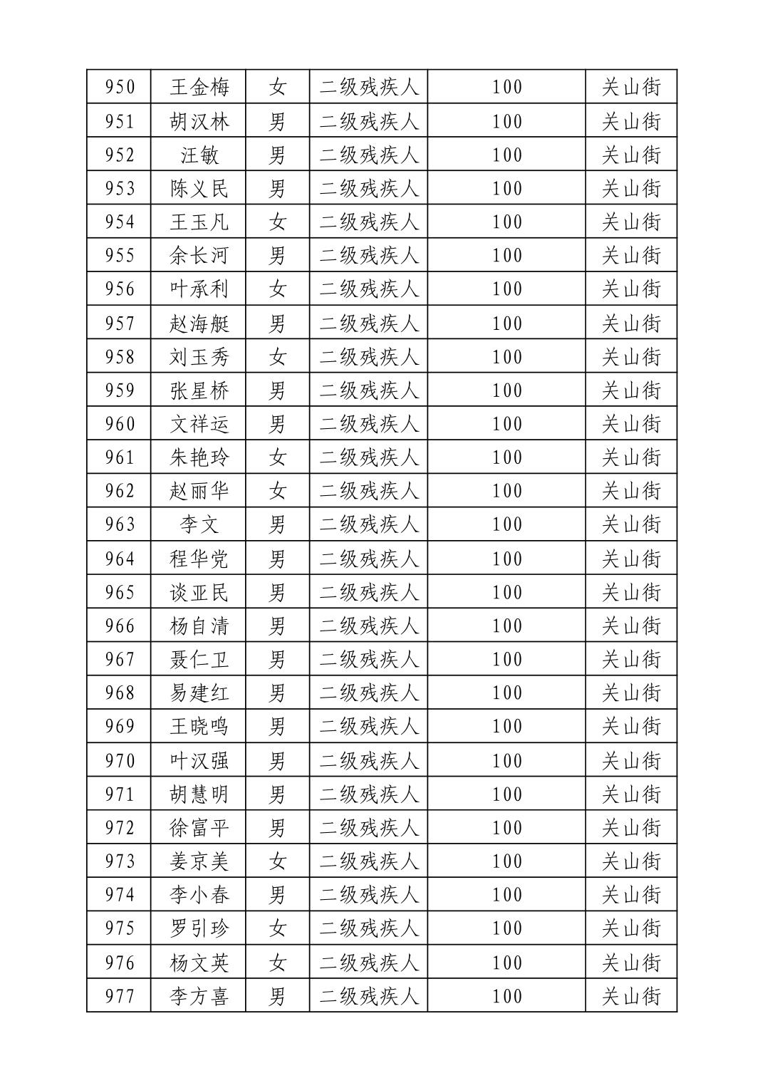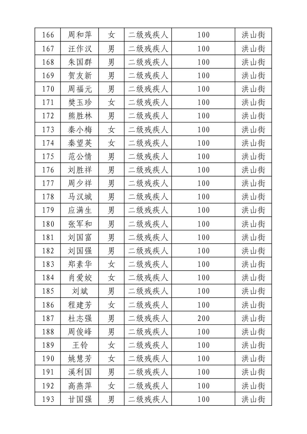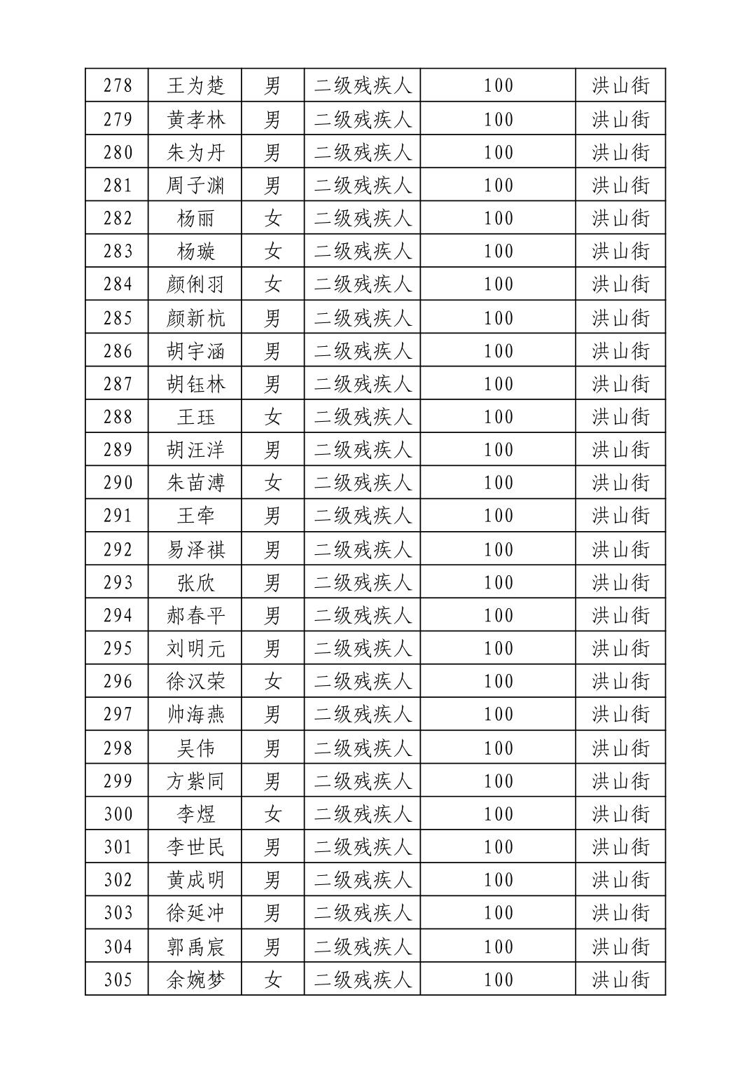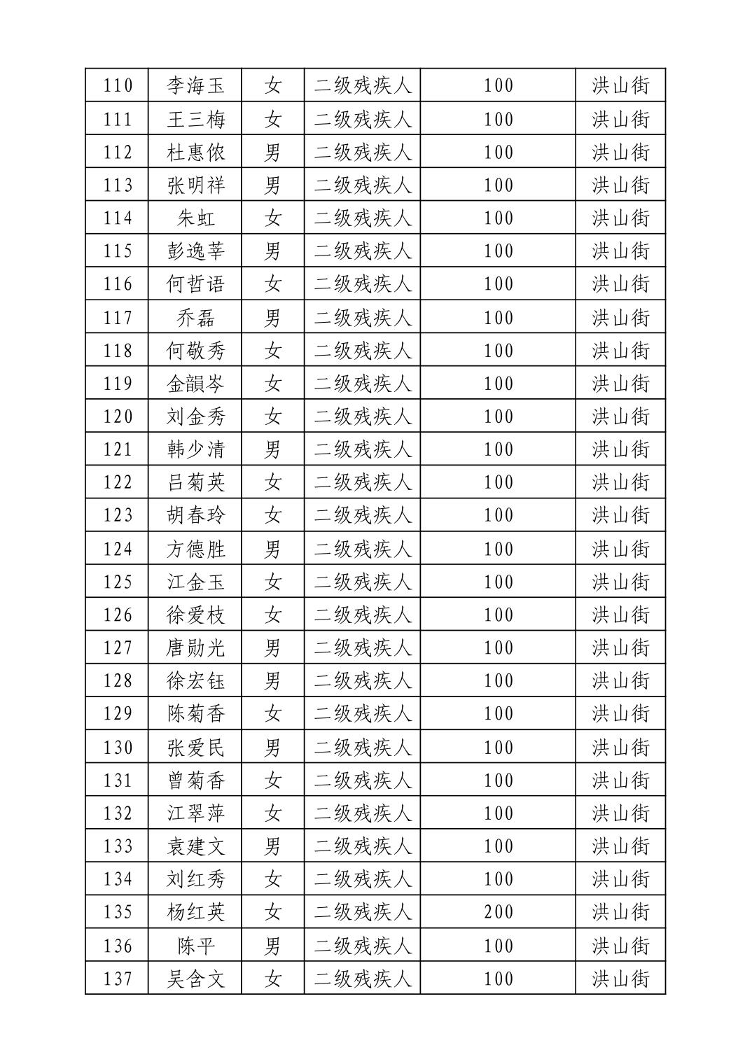 名 称:2025年8月武汉市洪山区重度残疾人护理补贴发放表