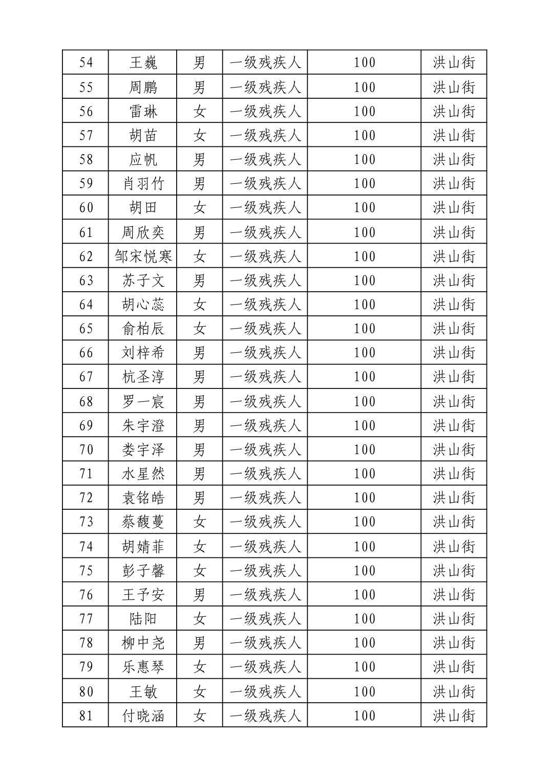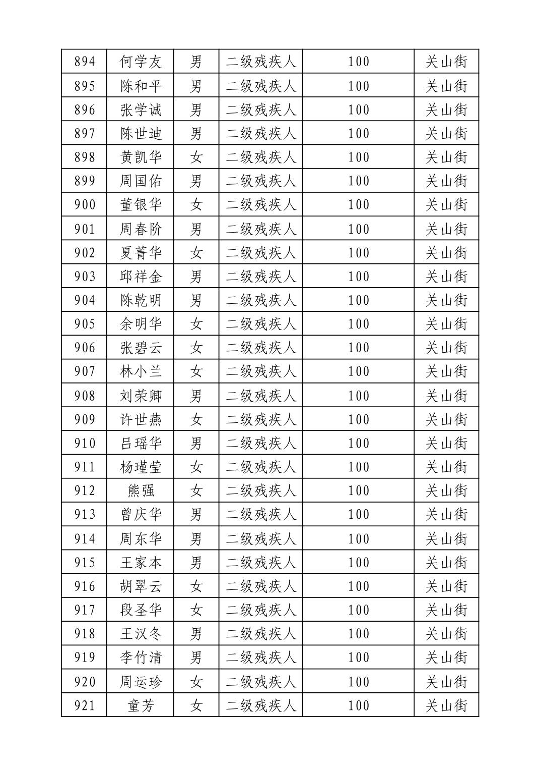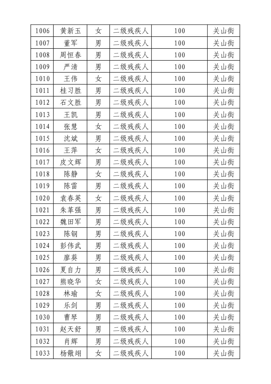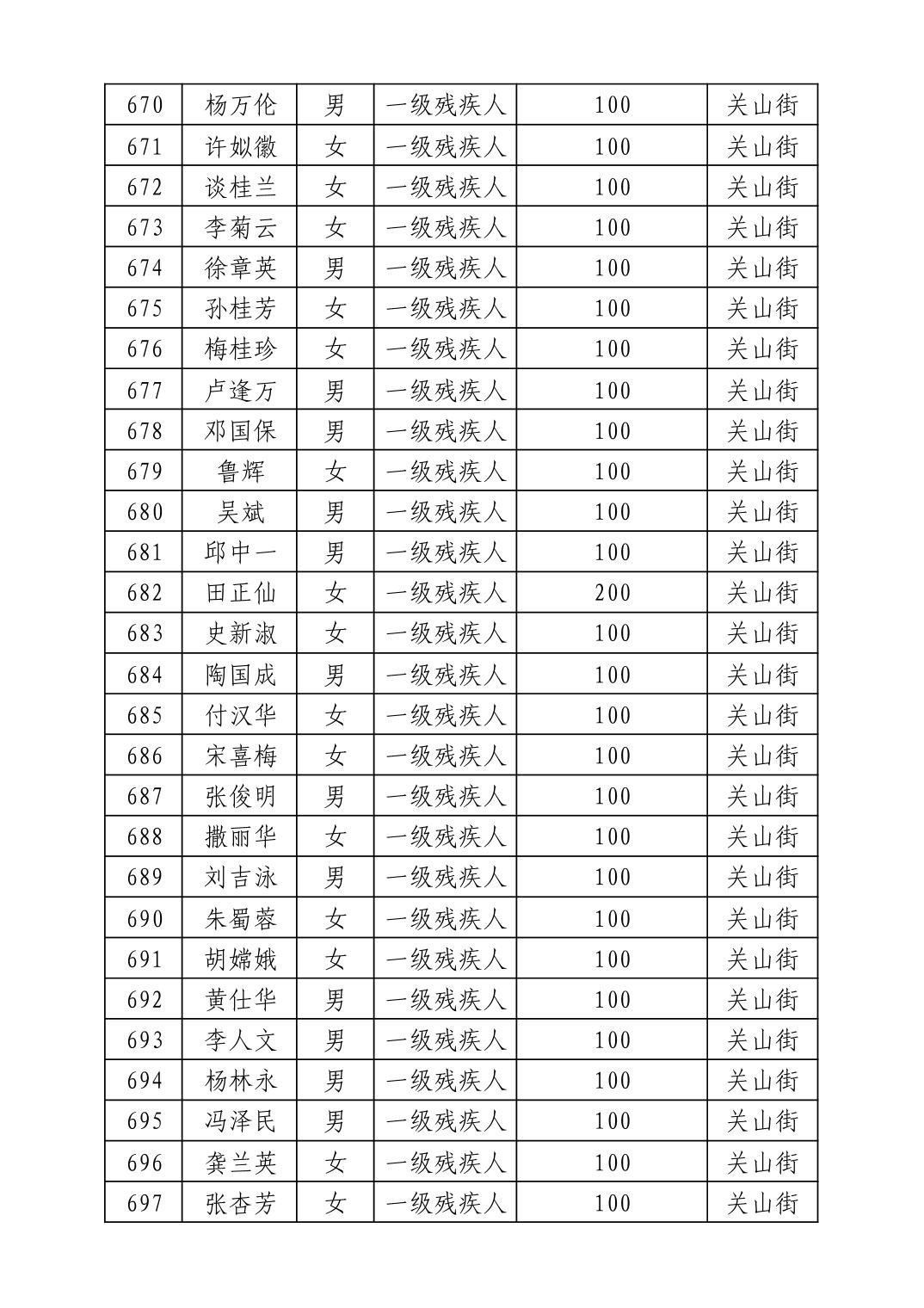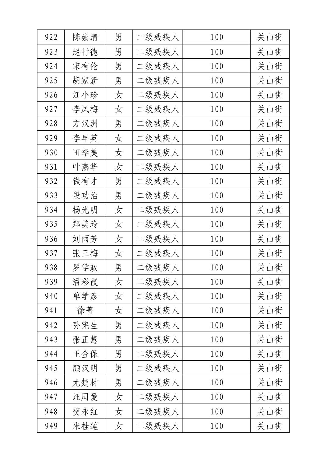 名 称:2025年8月武汉市洪山区重度残疾人护理补贴发放表