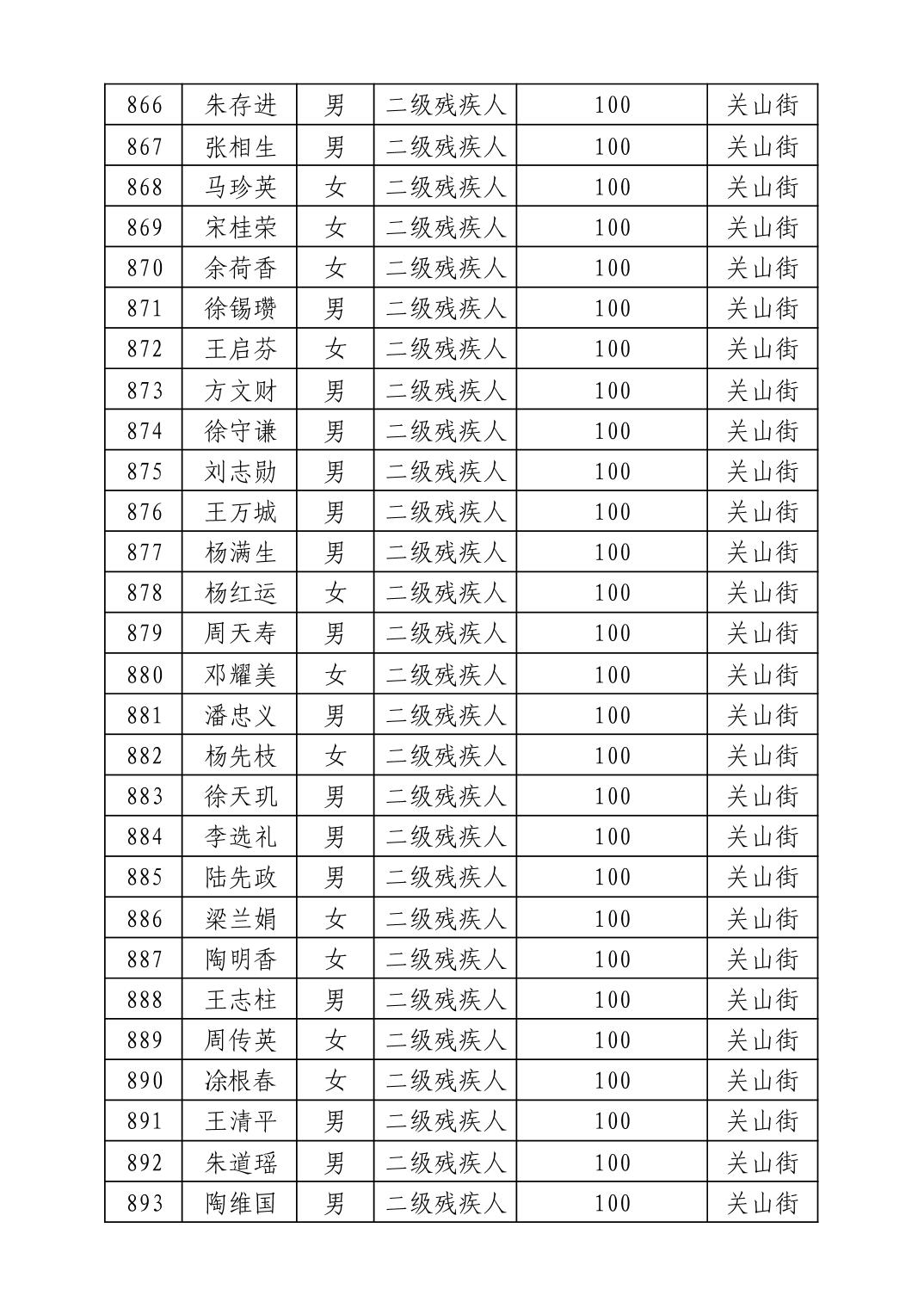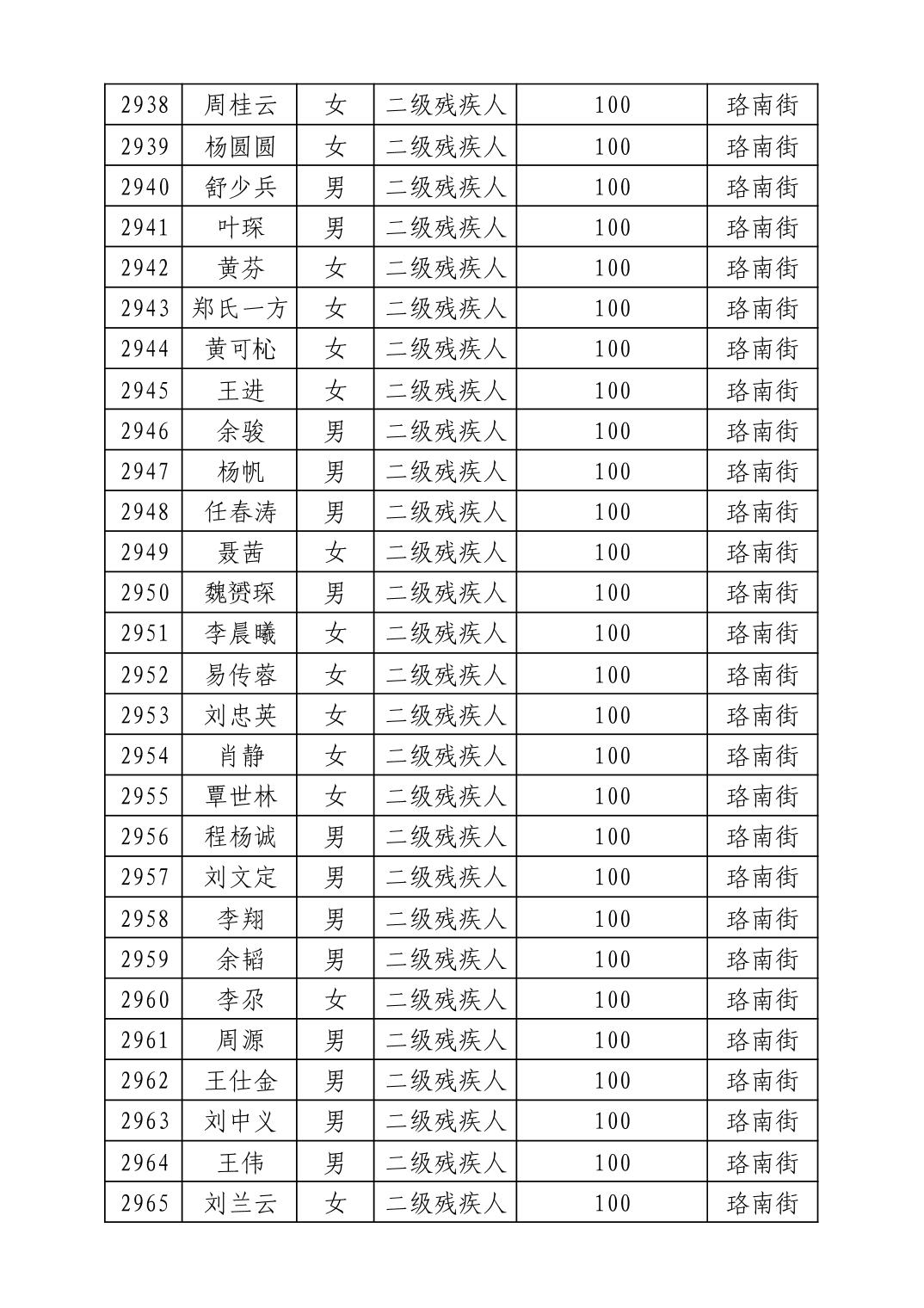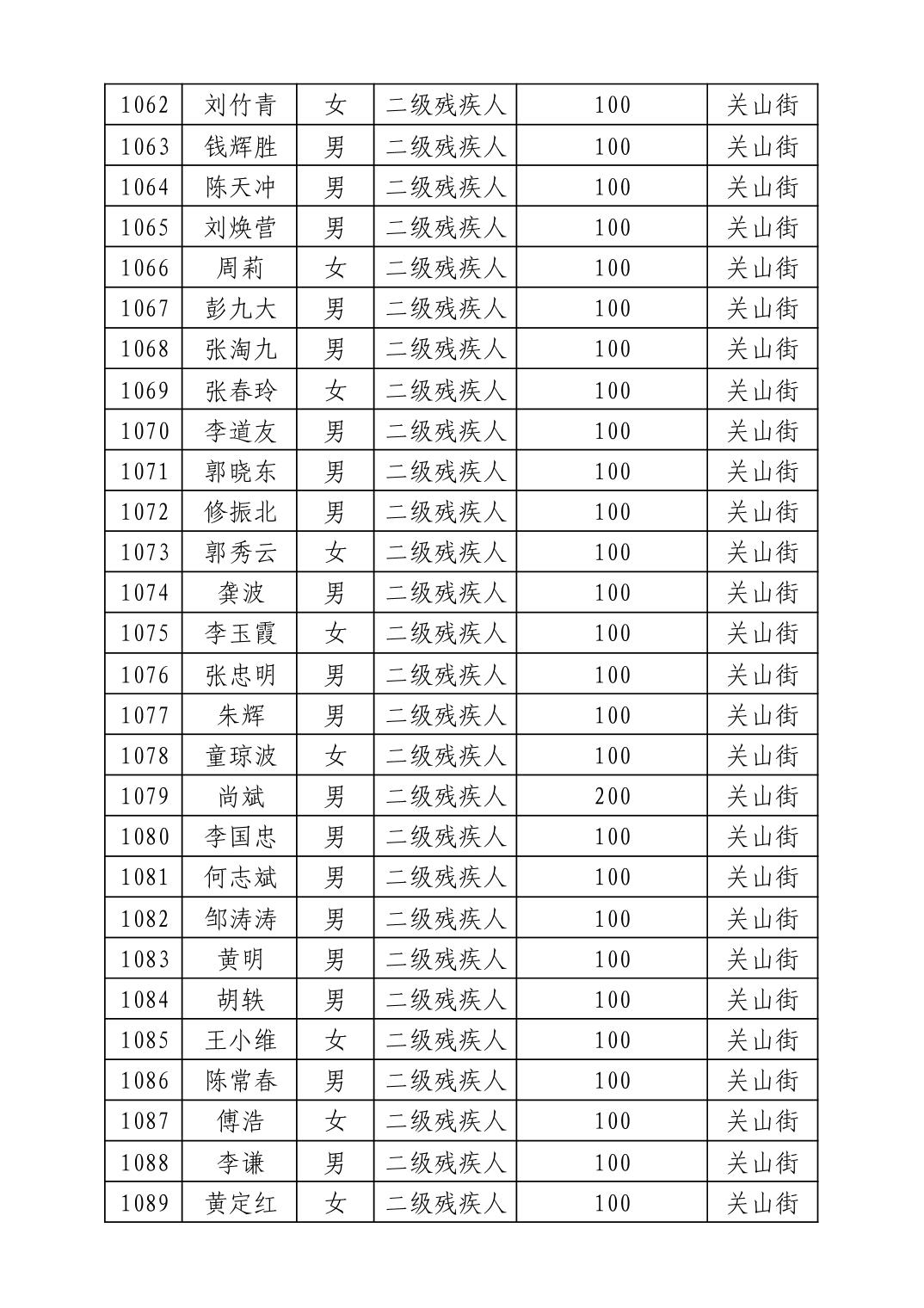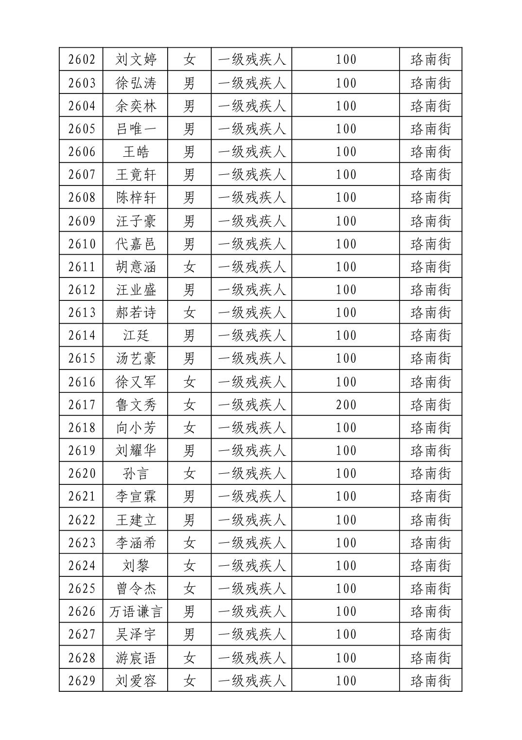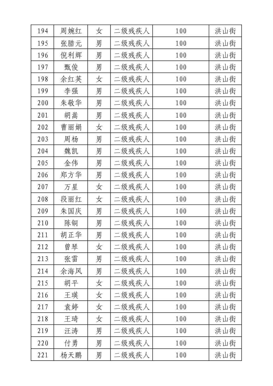 名 称:2025年8月武汉市洪山区重度残疾人护理补贴发放表