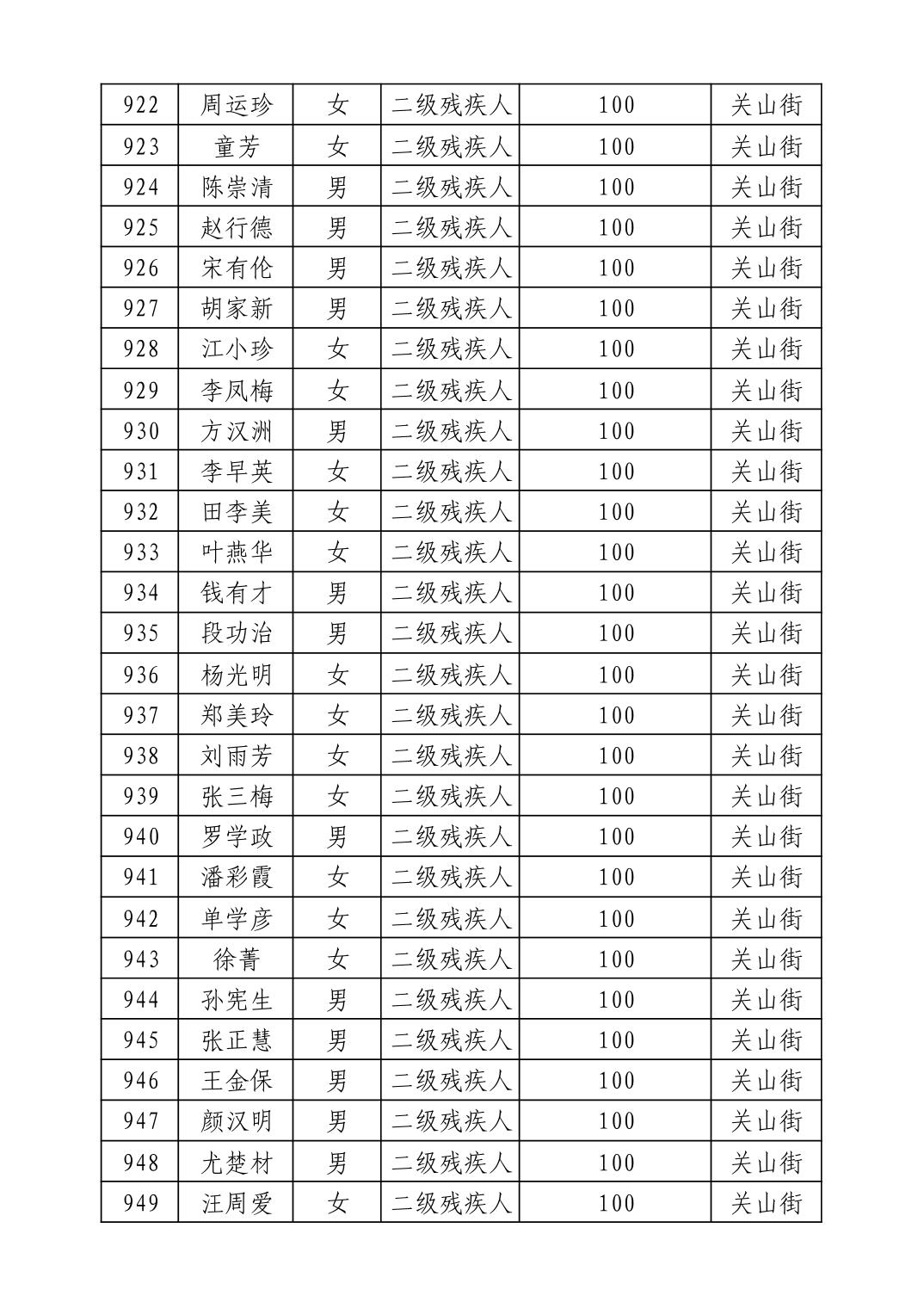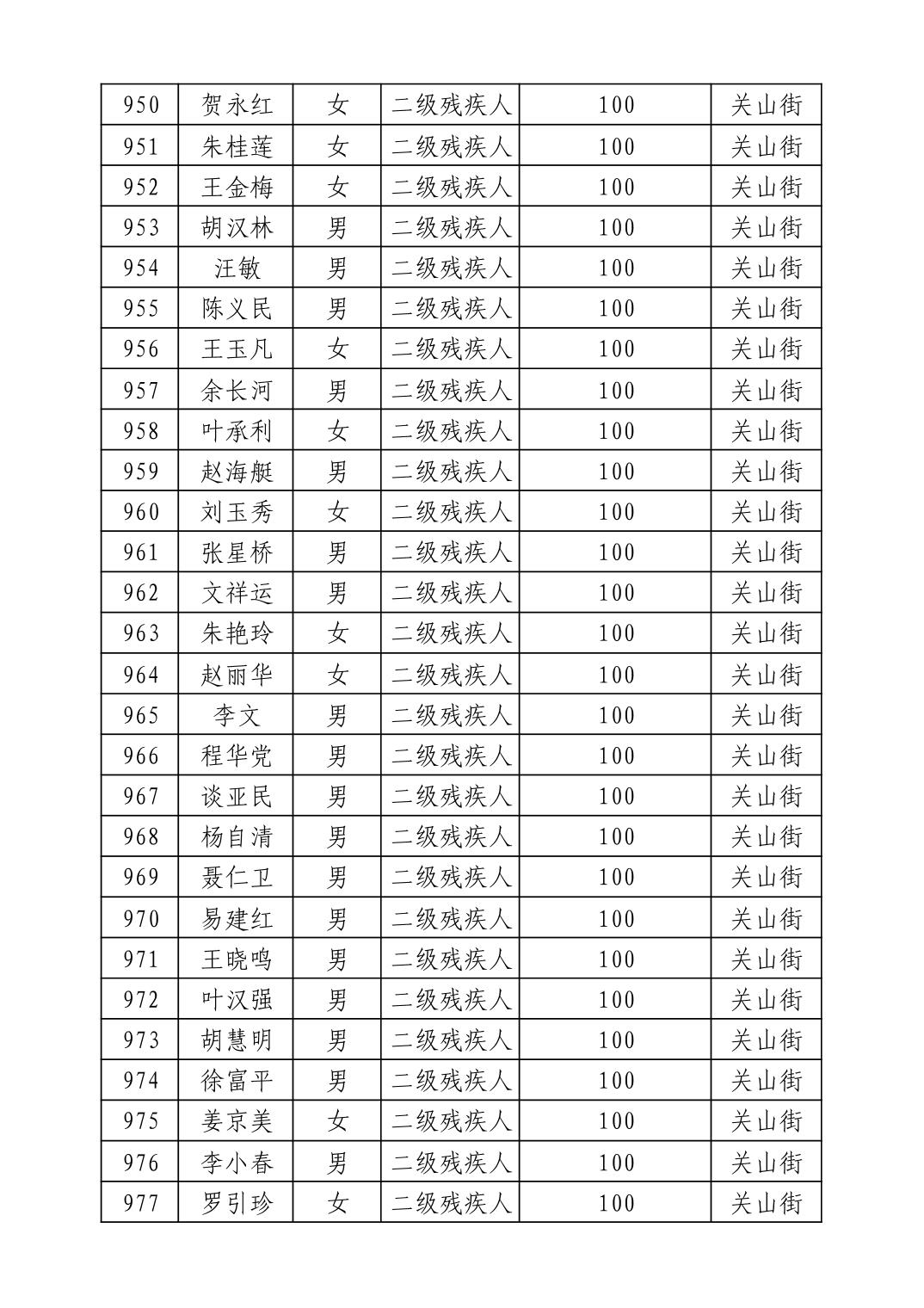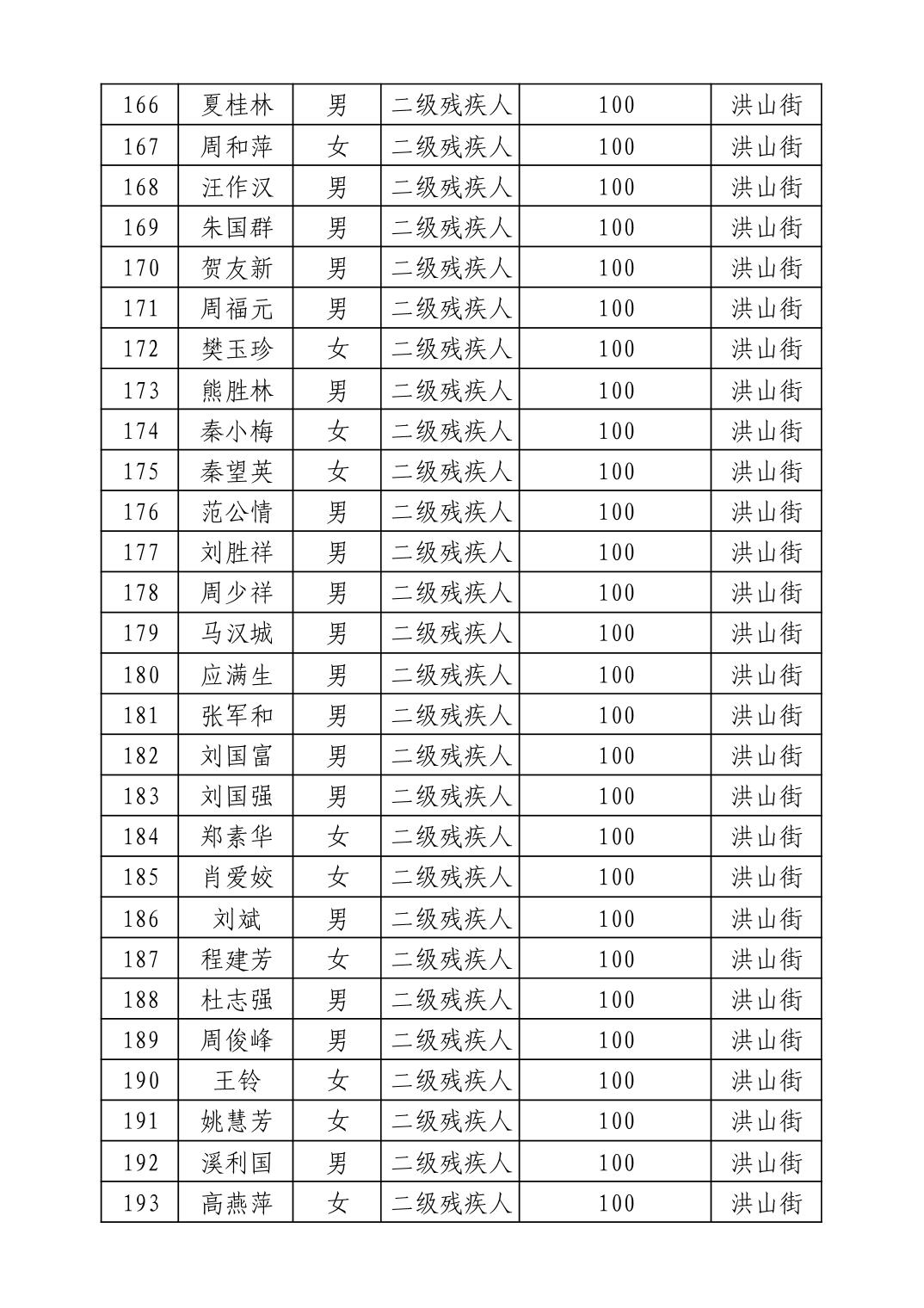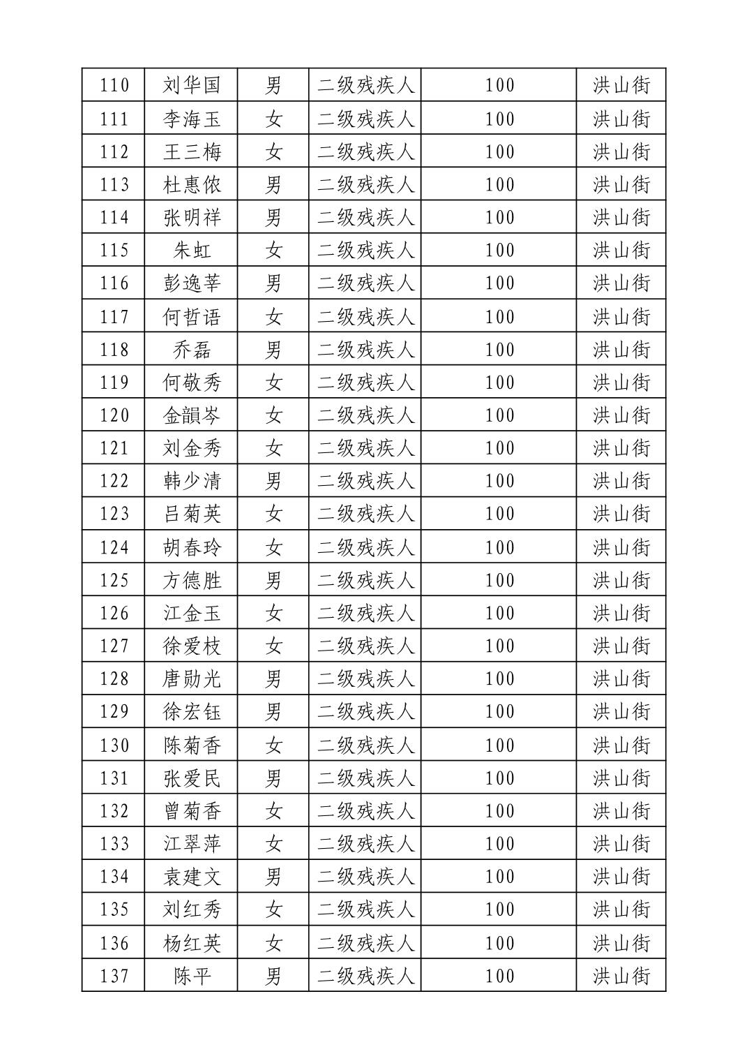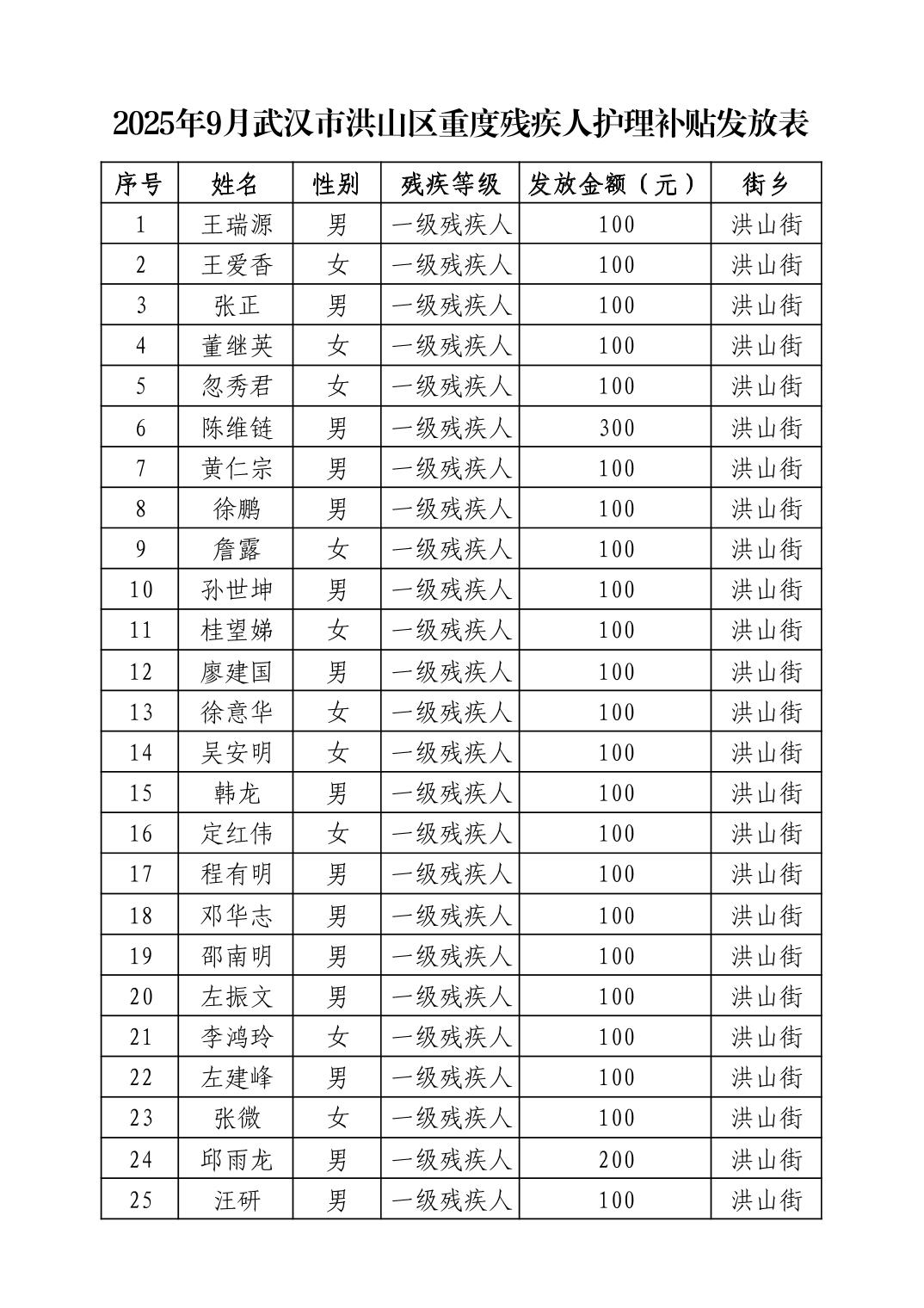 名 称:2025年9月武汉市洪山区重度残疾人护理补贴发放表