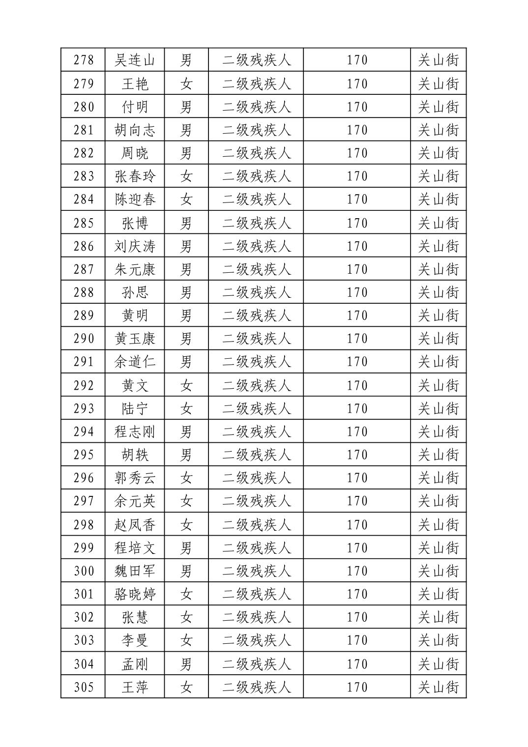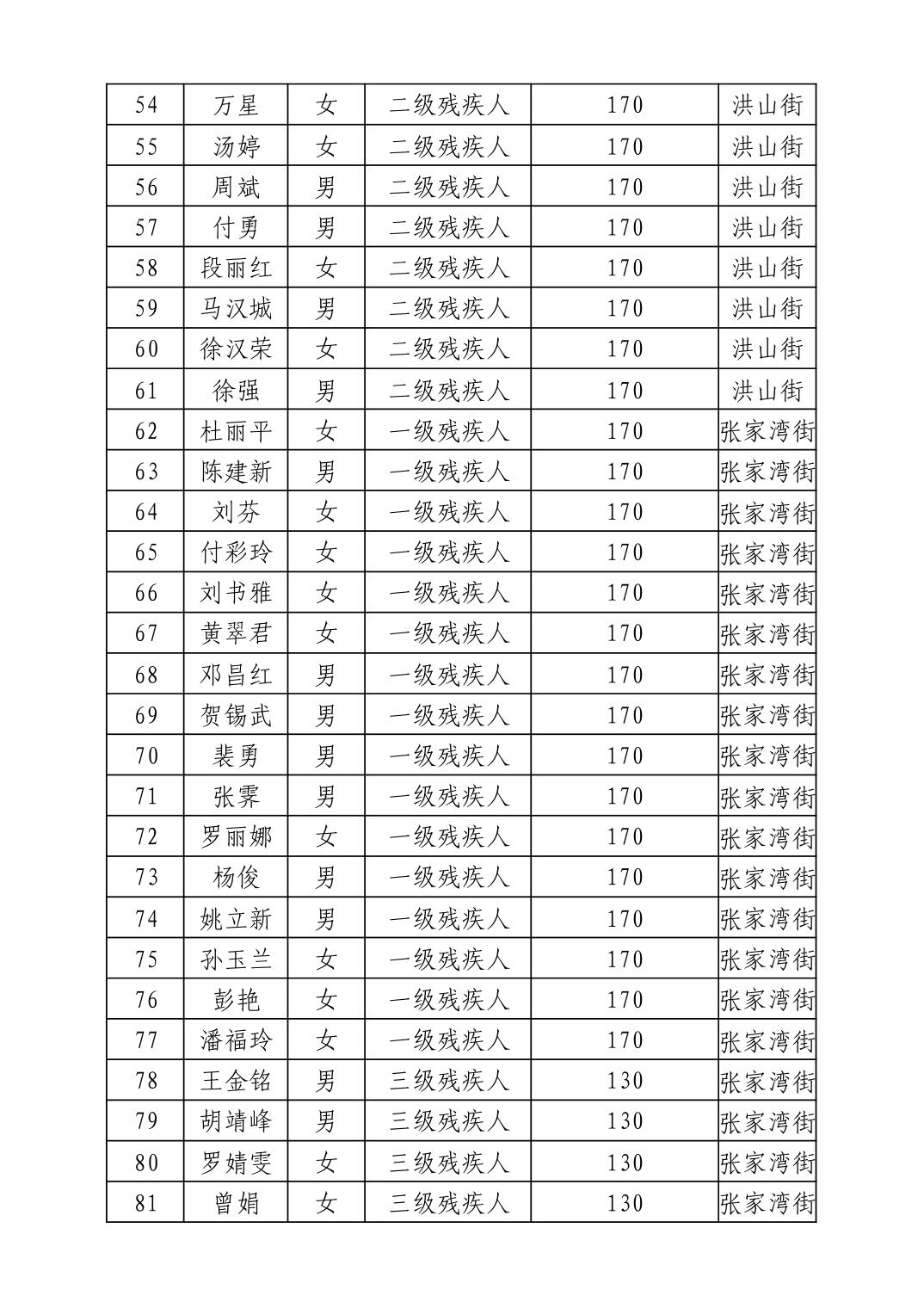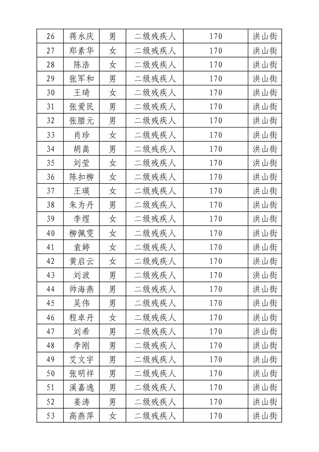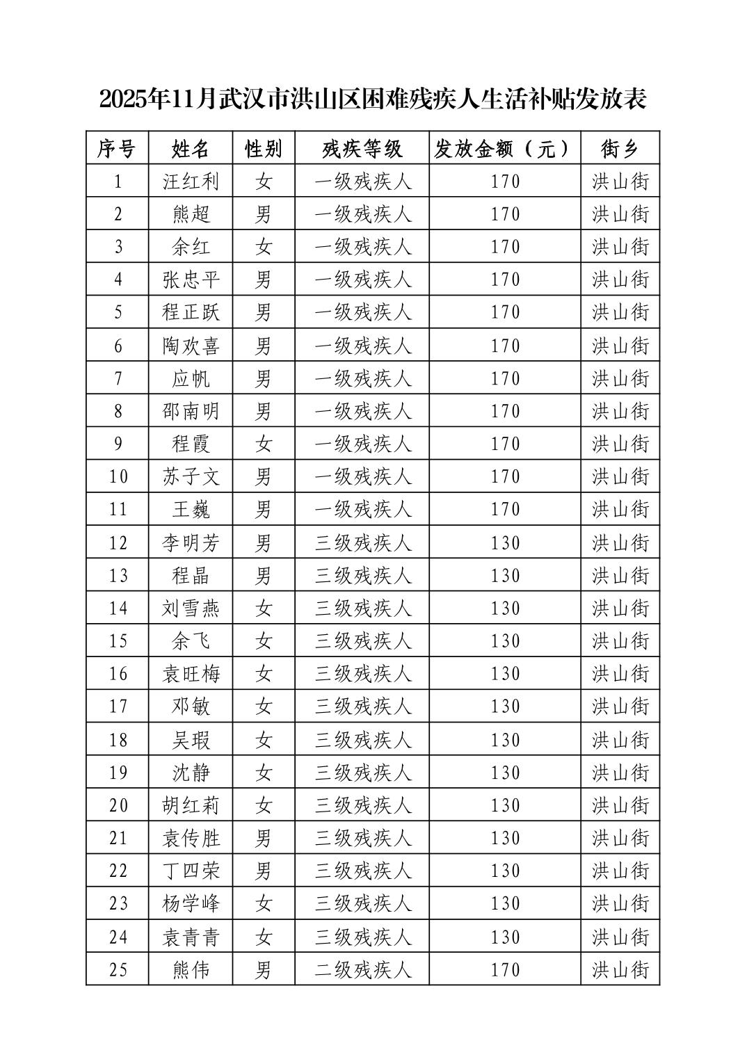 名 称:2025年11月武汉市洪山区困难残疾人生活补贴发放表