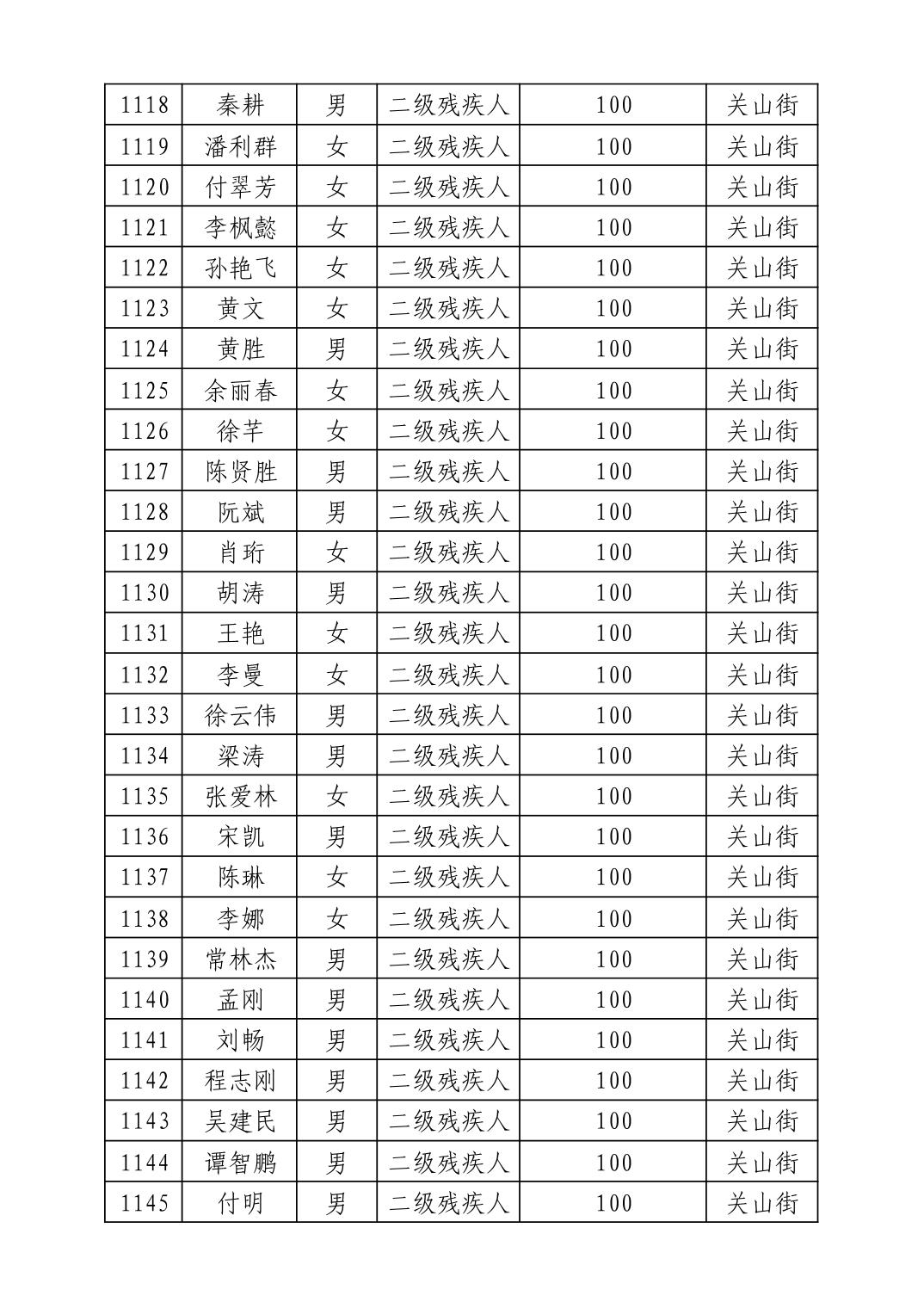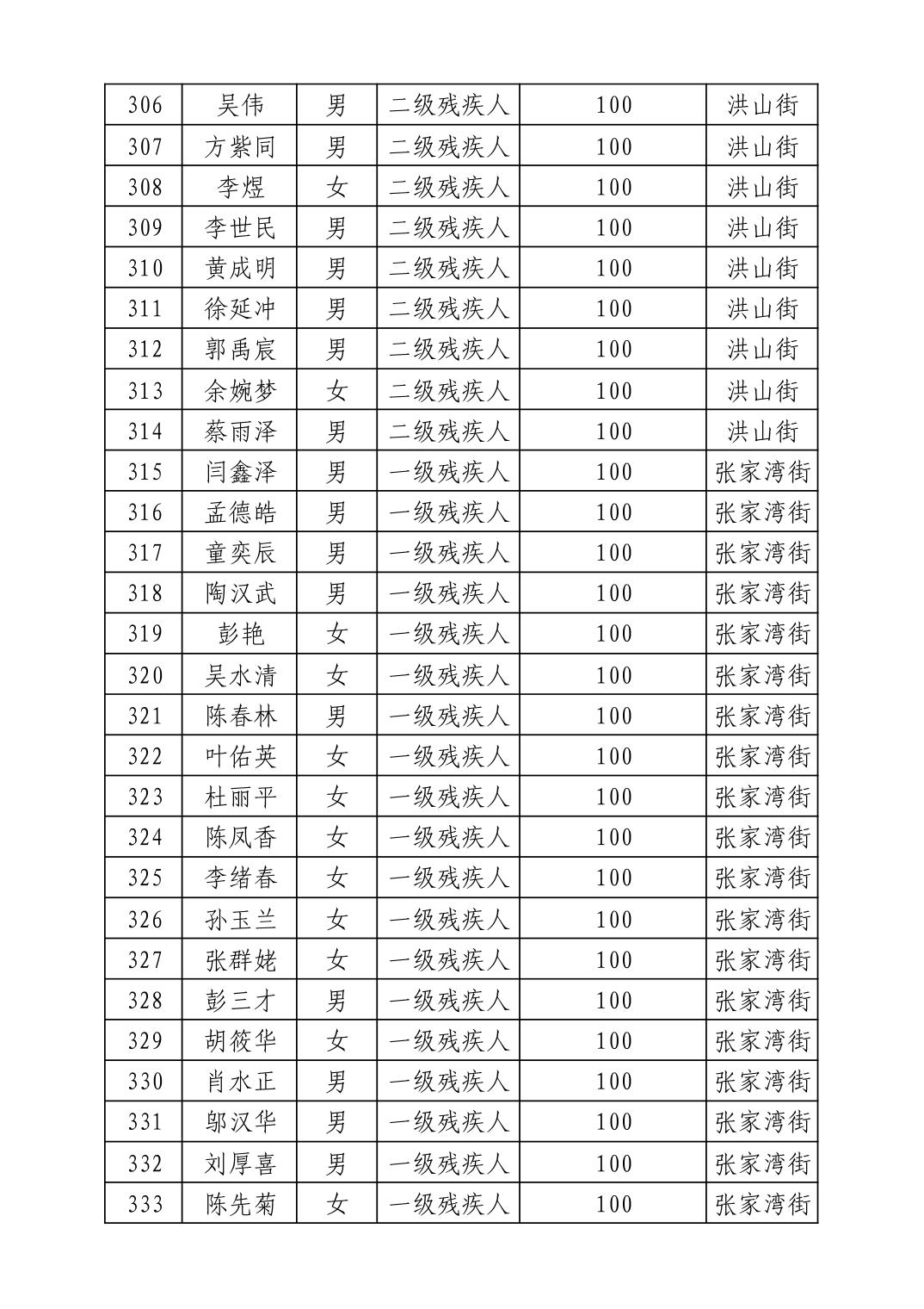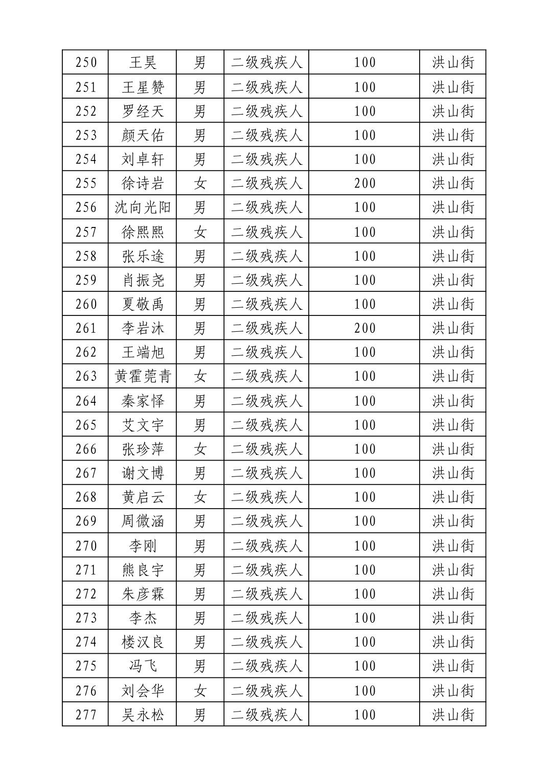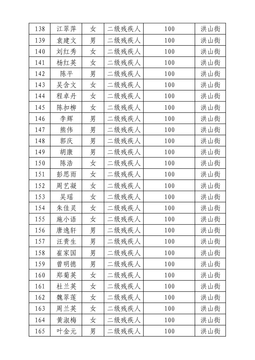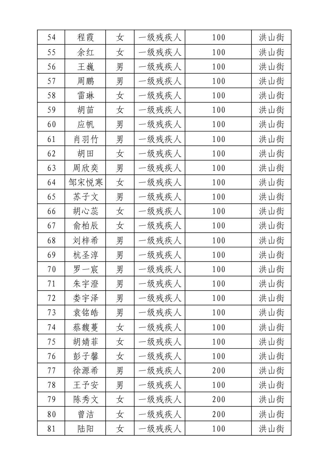 名 称:2025年11月武汉市洪山区重度残疾人护理补贴发放表