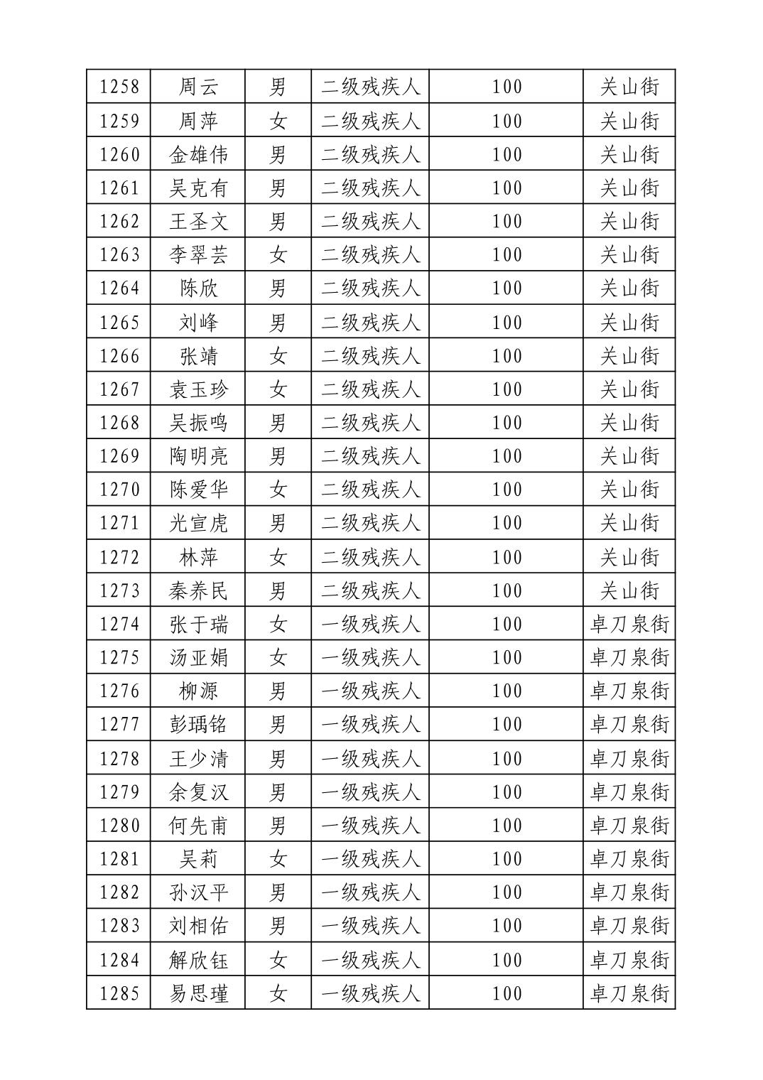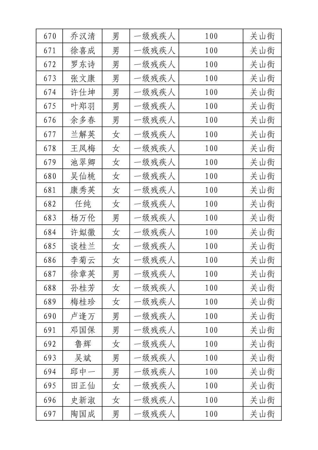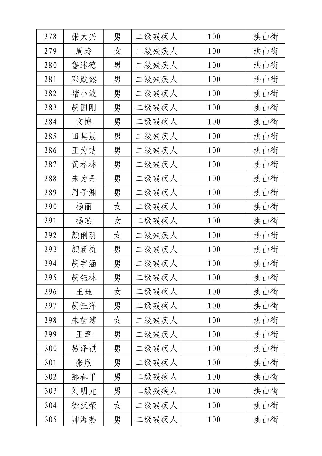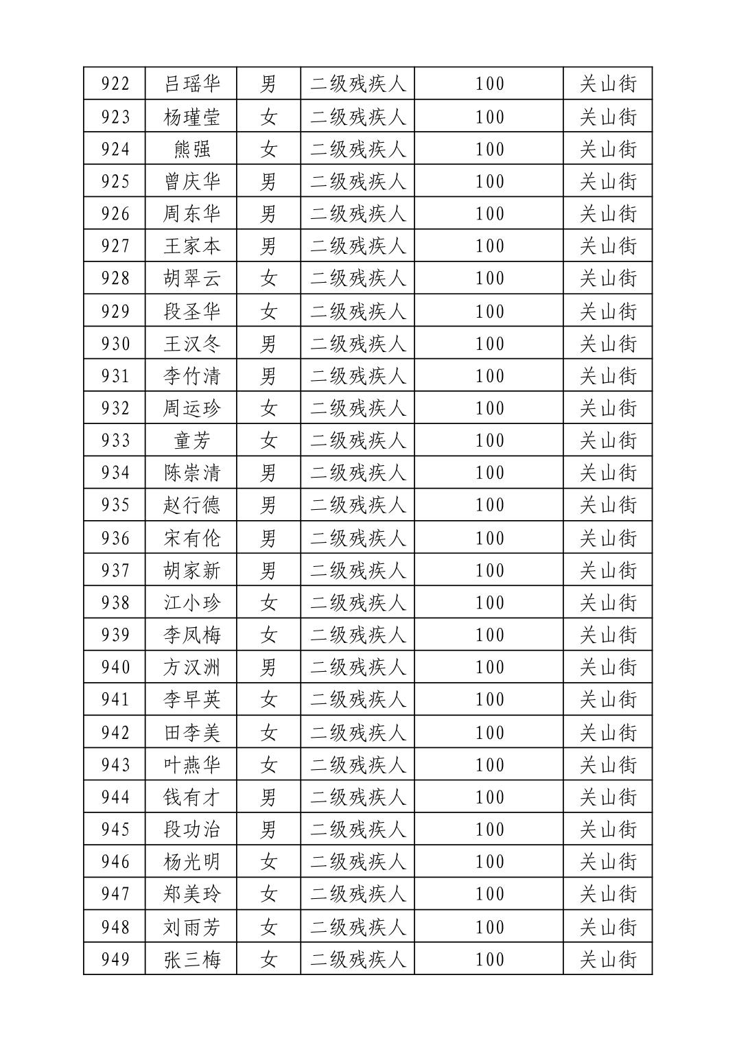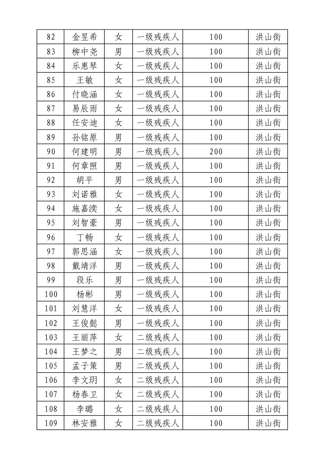 名 称:2025年11月武汉市洪山区重度残疾人护理补贴发放表