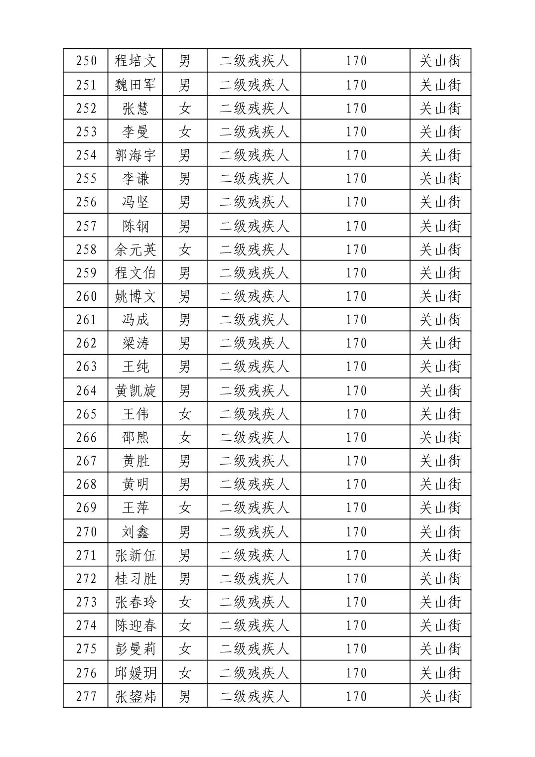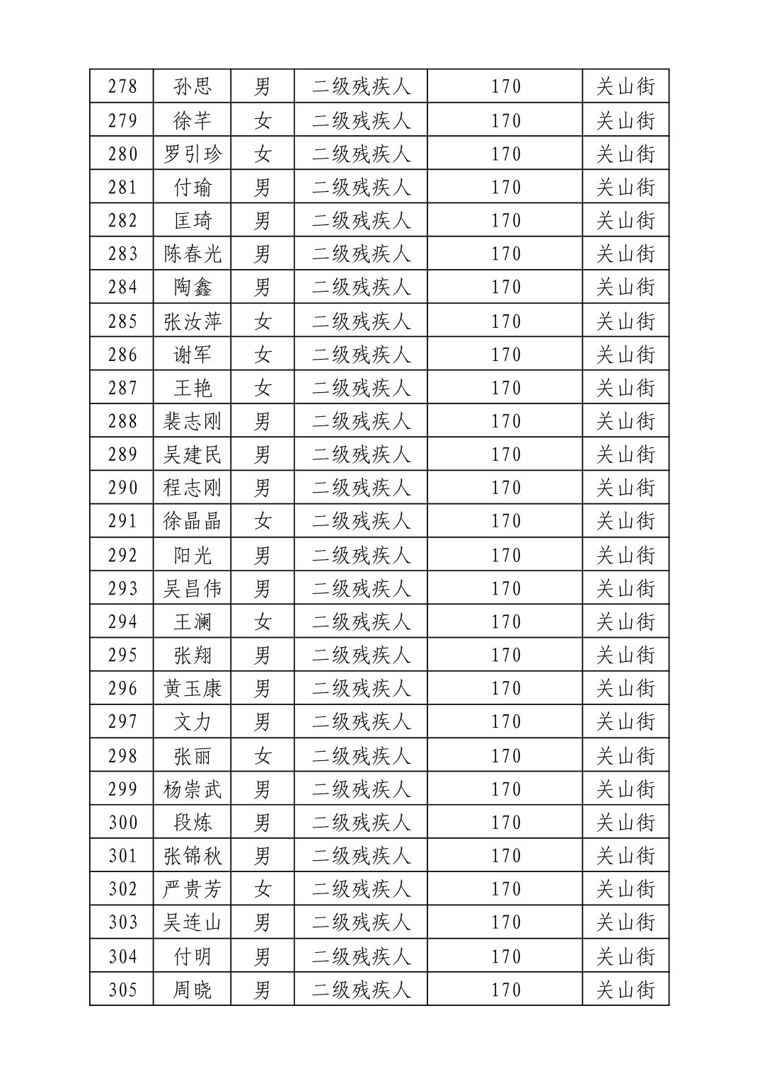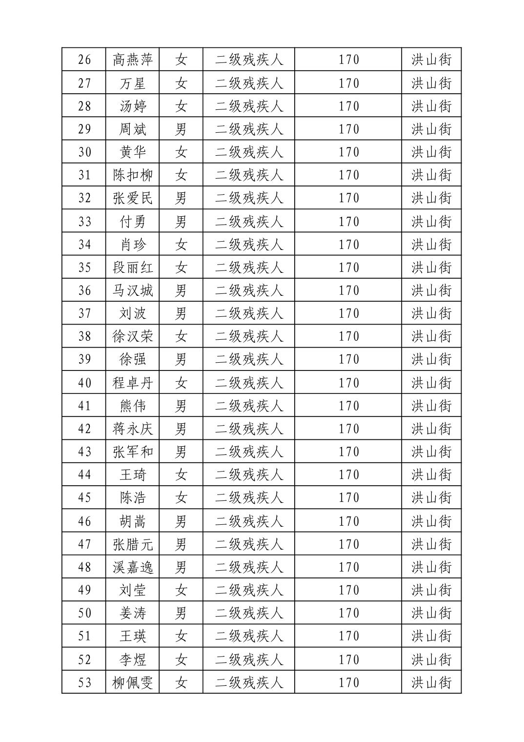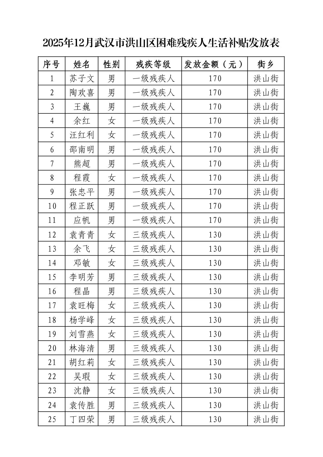名 称:2025年12月武汉市洪山区困难残疾人生活补贴发放表