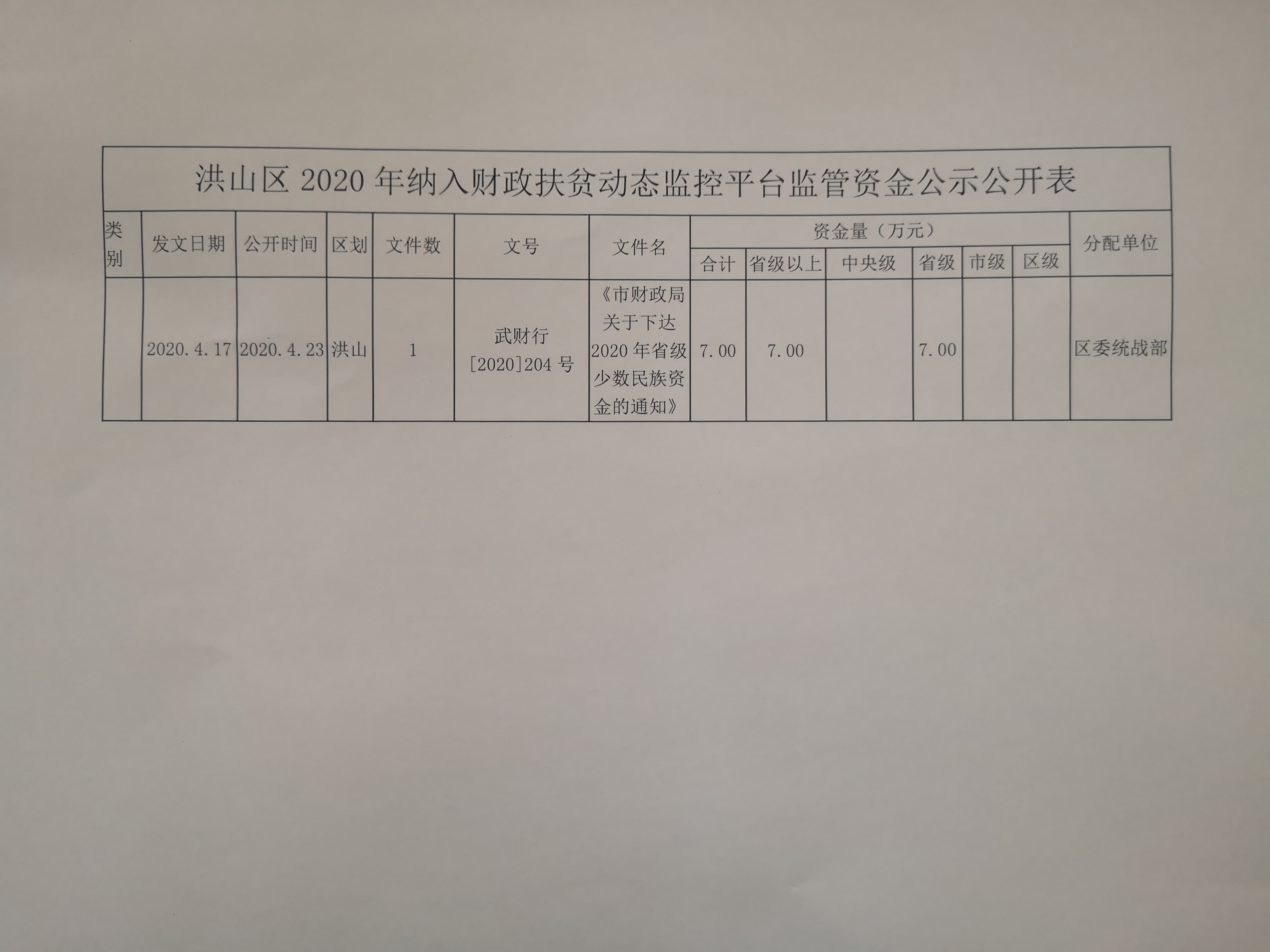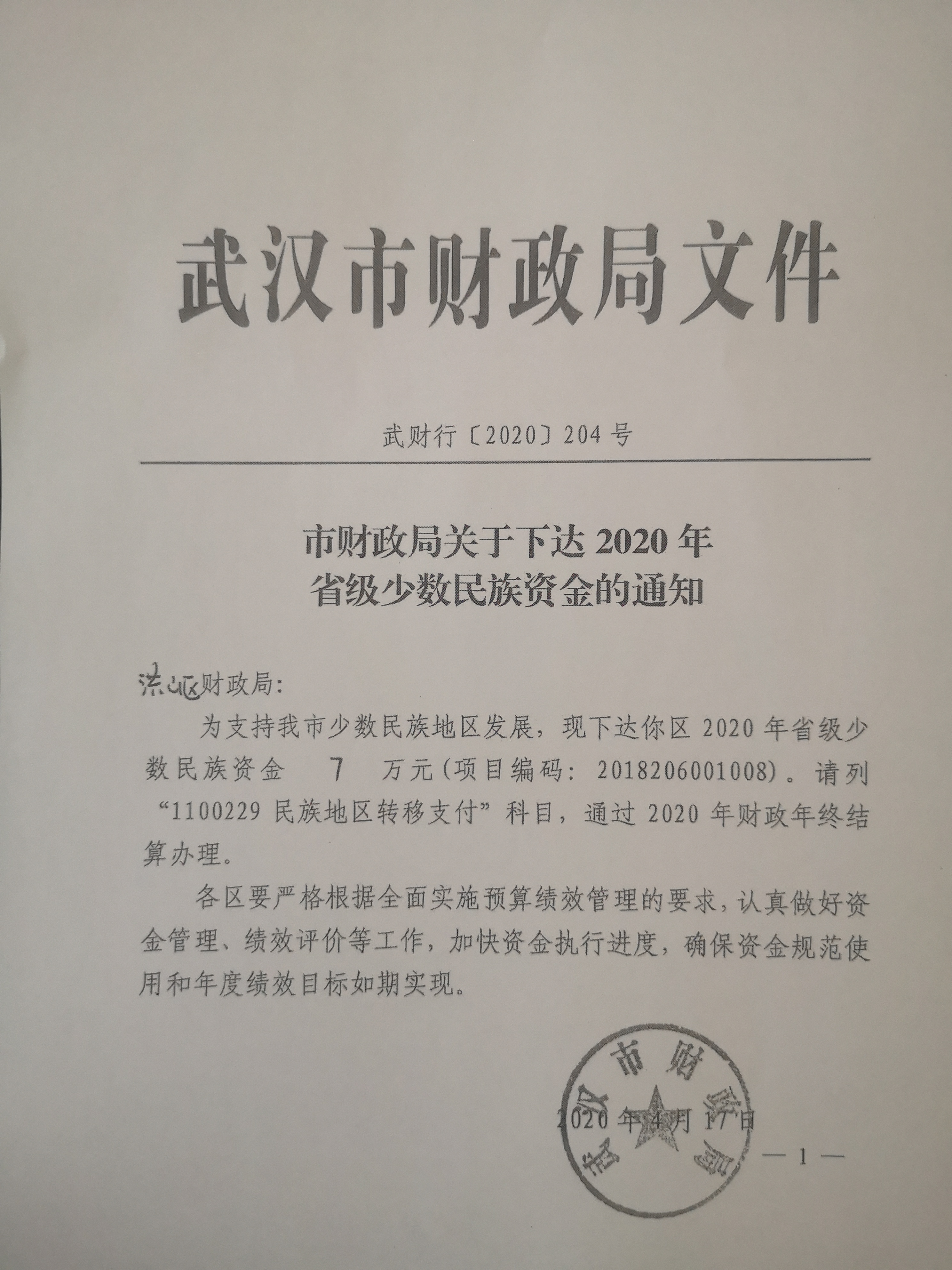 名 称:市财政局关于下达2020年省级少数民族资金的通知