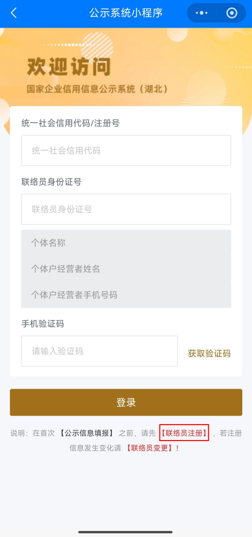 2、注册完毕后,以后每次输入统一社会信用代码/注册号以及联络员证件号码,系统自动带出其余信息,点击“获取验证码”,验证通过后即可快速登录。