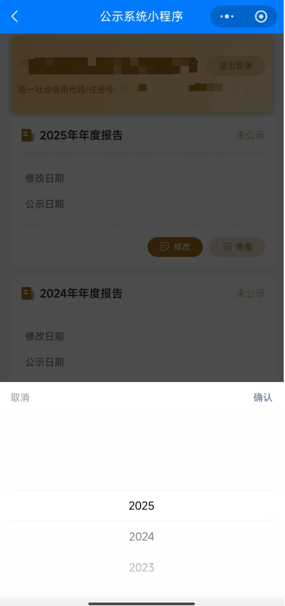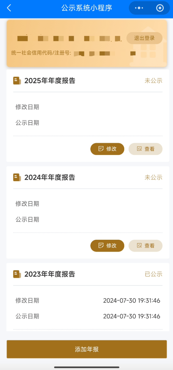 成功登录后,自动跳转到年度报告管理页面,可以查看历年已公示或已修改待公示年报。点击“添加年报”按钮,选择对应年度,点击确定按钮后,跳转到年报填报页面。