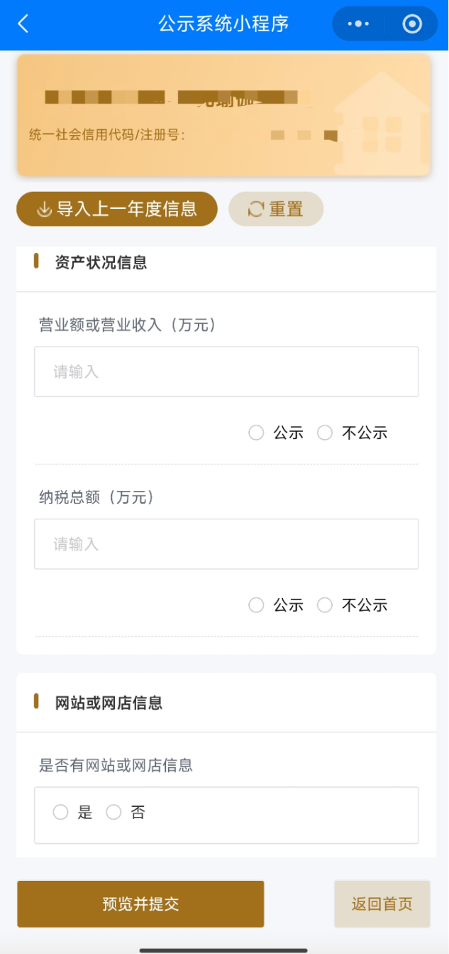 - 进入填报页面后,个体工商户需按照步骤逐一填写空白信息。为方便填写,可点击“导入上一年度信息”按钮,导入上一年度年度报告信息。填写完毕后,点击“预览并提交”。