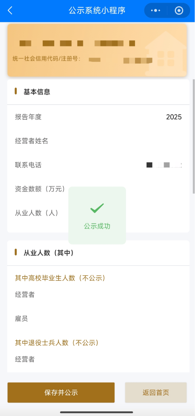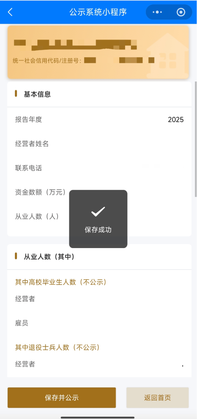- 进入年报预览页面,预览无误后,点击“保存并公示”,显示“公示成功”后即可完成年报填报。