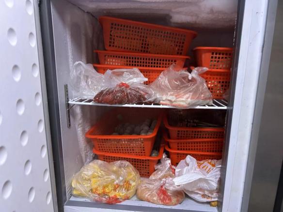 上榜理由:1、冰箱中的原材料生熟混放,叠放污染;2、卫生环境脏乱,“三防设施”不到位;3、成品随意摆放在暴露环境中。
