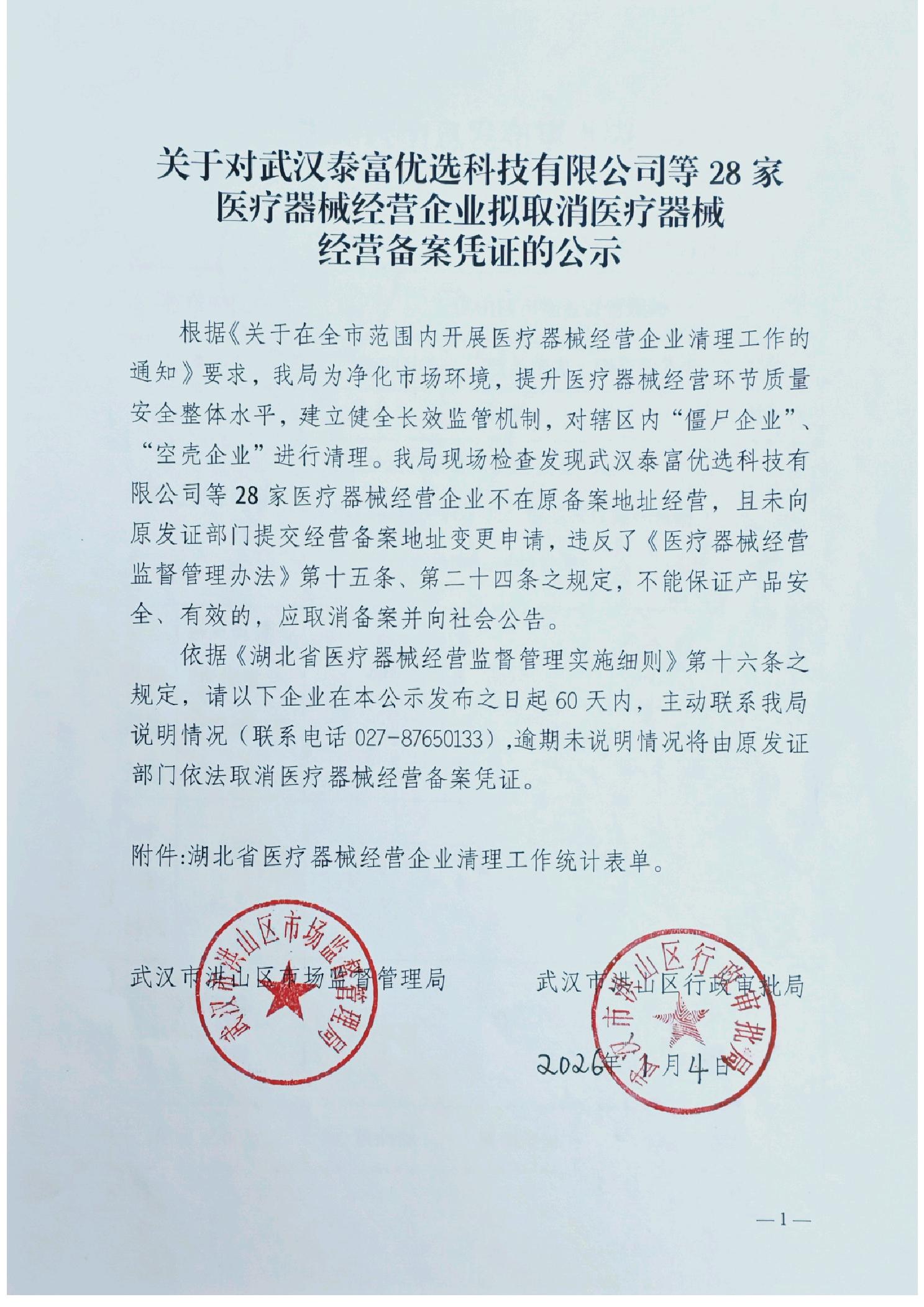 名 称:关于对武汉泰富优选科技有限公司等28家医疗器械经营企业拟取消医疗器械经营备案凭证的公示