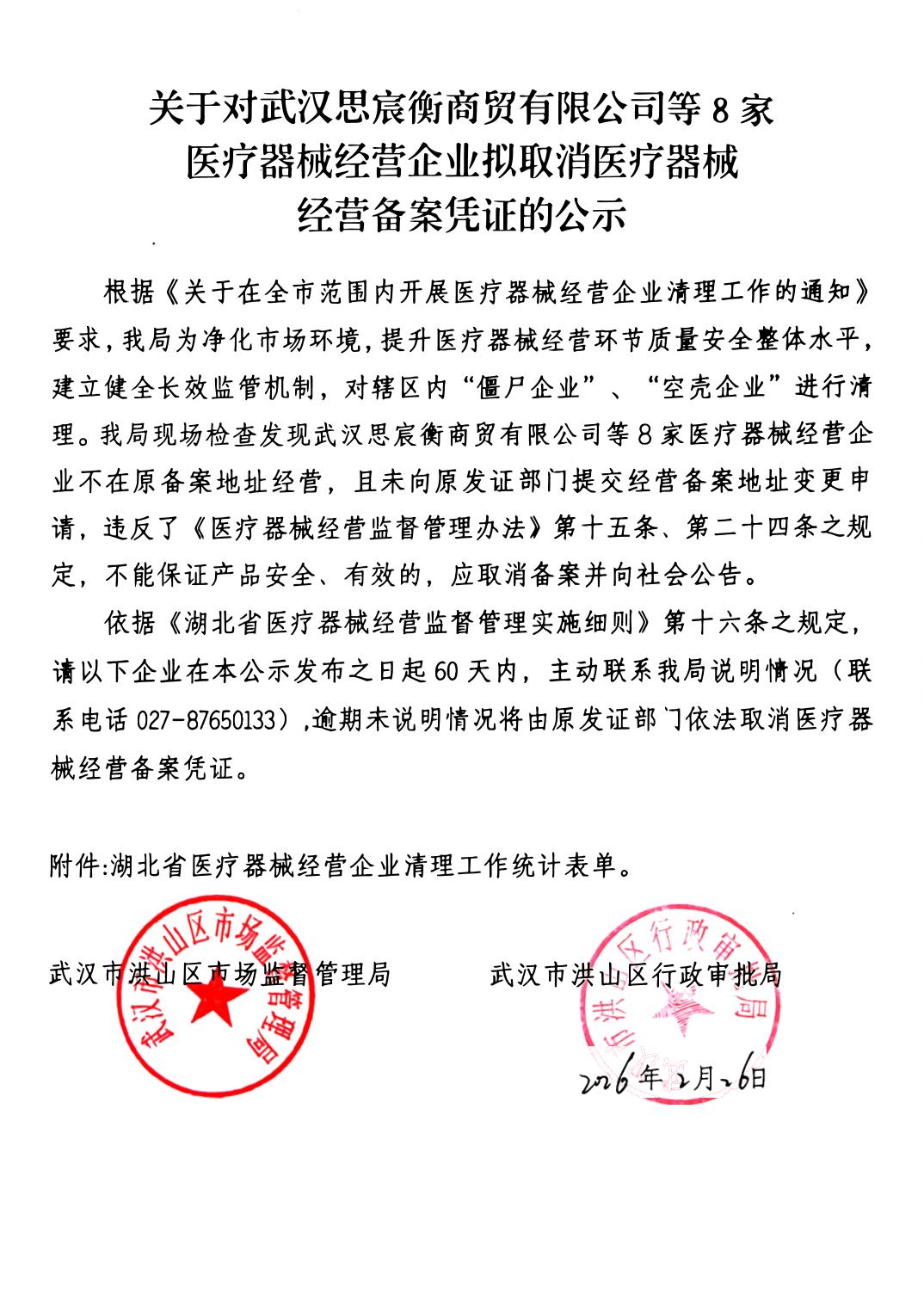 名 称:关于对武汉思宸衡商贸有限公司等8家医疗器械经营企业拟取消医疗器械经营备案凭证的公示