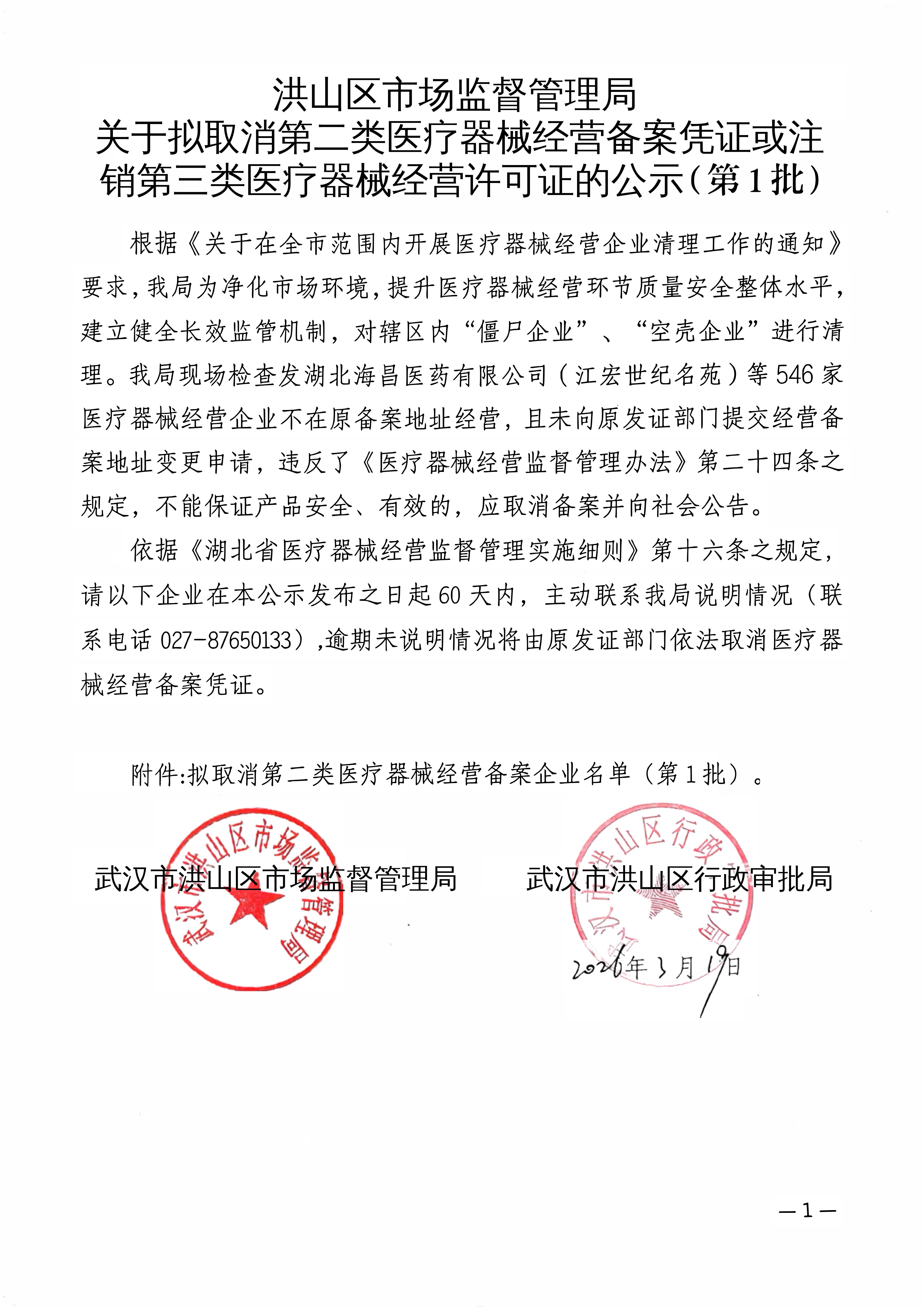 名 称:洪山区市场监督管理局关于拟取消第二类医疗器械经营备案凭证或注销第三类医疗器械经营许可证的公示(第1批)