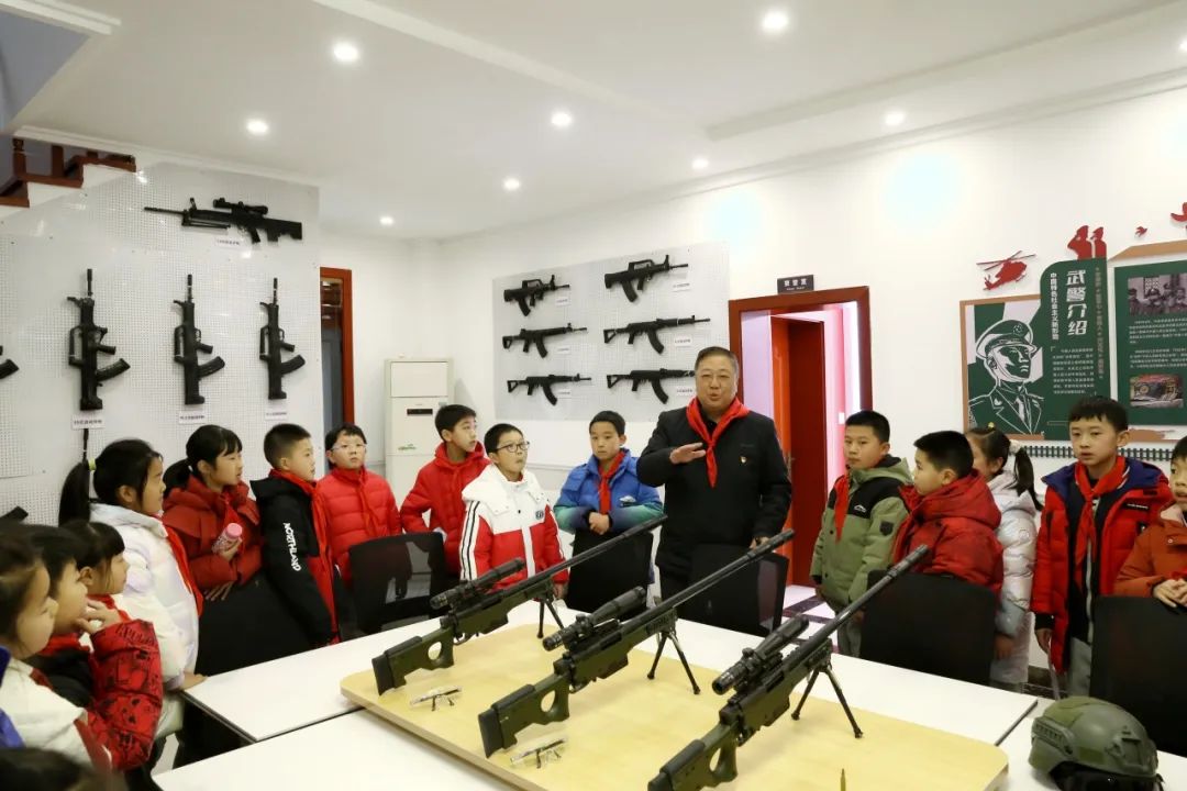 退役军人宋巨生,退休前曾任武警湖北总队副参谋长,2024年被洪山区评为“立公为民志愿服务最美退役军人”。他带领孩子们参观军事军械展览、近距离观察军事模型和装备的同时,介绍了中国人民武装警察部队的发展史,让孩子们直观感受我国军事力量的强大。随后,大家来到展厅荣誉室,聆听退役军人的军旅故事。这些真实而感人的事迹,深深触动了学生们的心灵,让他们深刻体会到爱国精神和军人的担当。